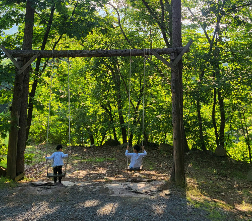이제는 본격적인 놀이타임. 아이들이 이름 지어준 '비밀놀이터'라는 곳에도 가본다. 아이들이 보기엔 뭔가 비밀스러웠던 걸까? 캠핑장에서 조금만 내려가다 보면 직접 만들었을 법한 시소도 있고, 그네도 있었다.