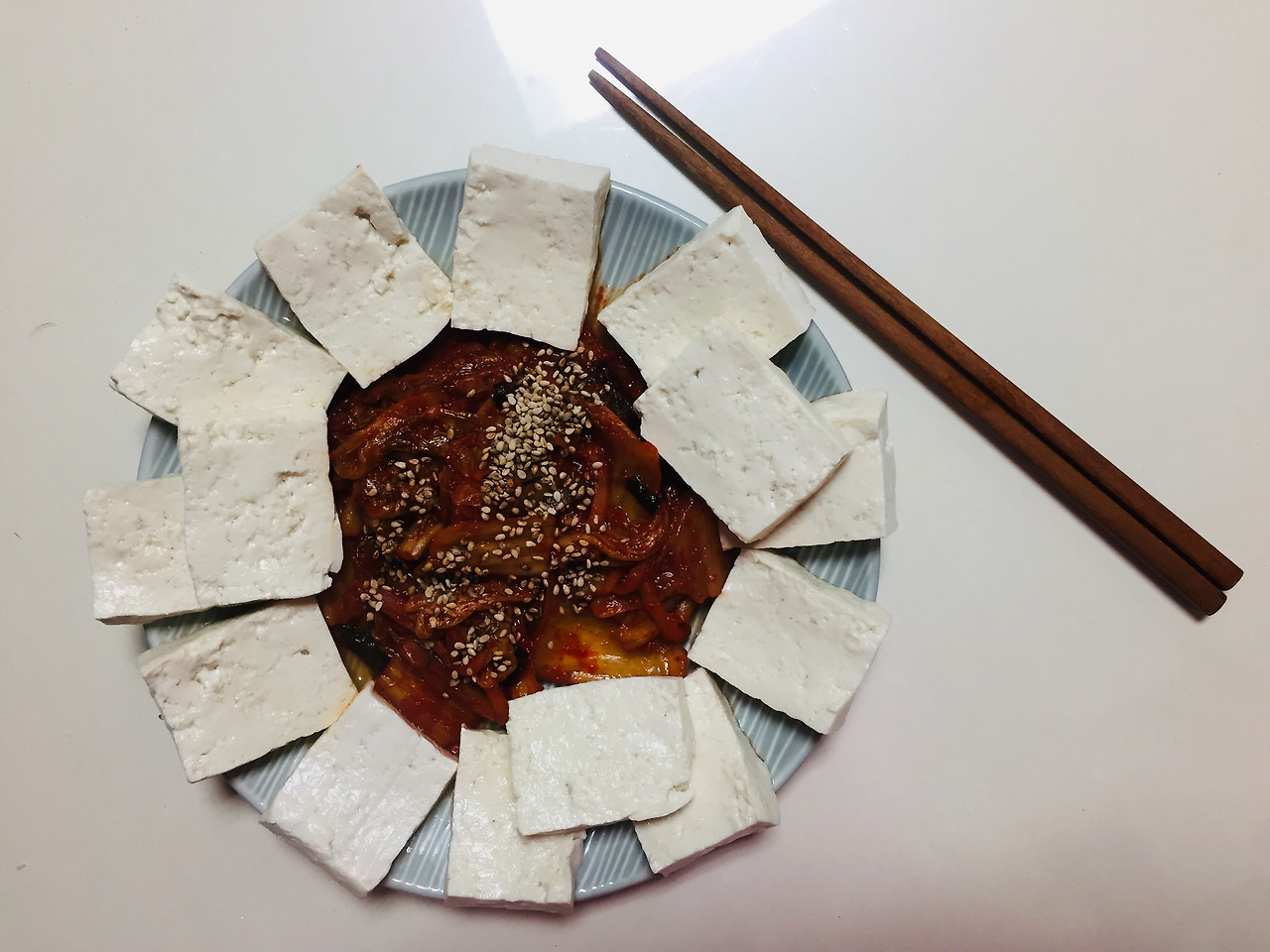 근래에 너무 잘 먹은 것 같아서 뱃살이 걱정됐어요. 그래서 두부 한 모를 사서 참기름 넣어 달달 볶은 묵은지와 함께 먹었습니다. 든든했어요.