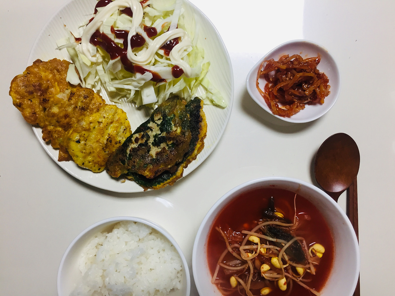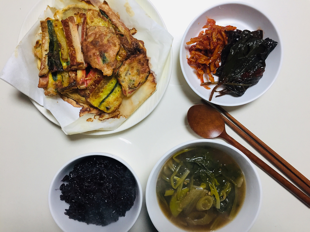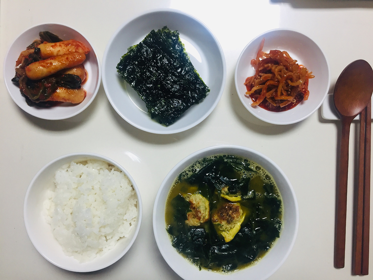 미역국에 동그랑땡이 빠져있죠. 식재료를 버리지 않고 다 먹자는 목표가 있어서 미역국에 동그랑땡을 넣는 무리수를..사실 맛도 없었어요. 저는 전 중에서 동그랑땡을 제일 좋아하지 않아서 이런저런 방법으로 해치우려고 노력을 많이 했습니다.