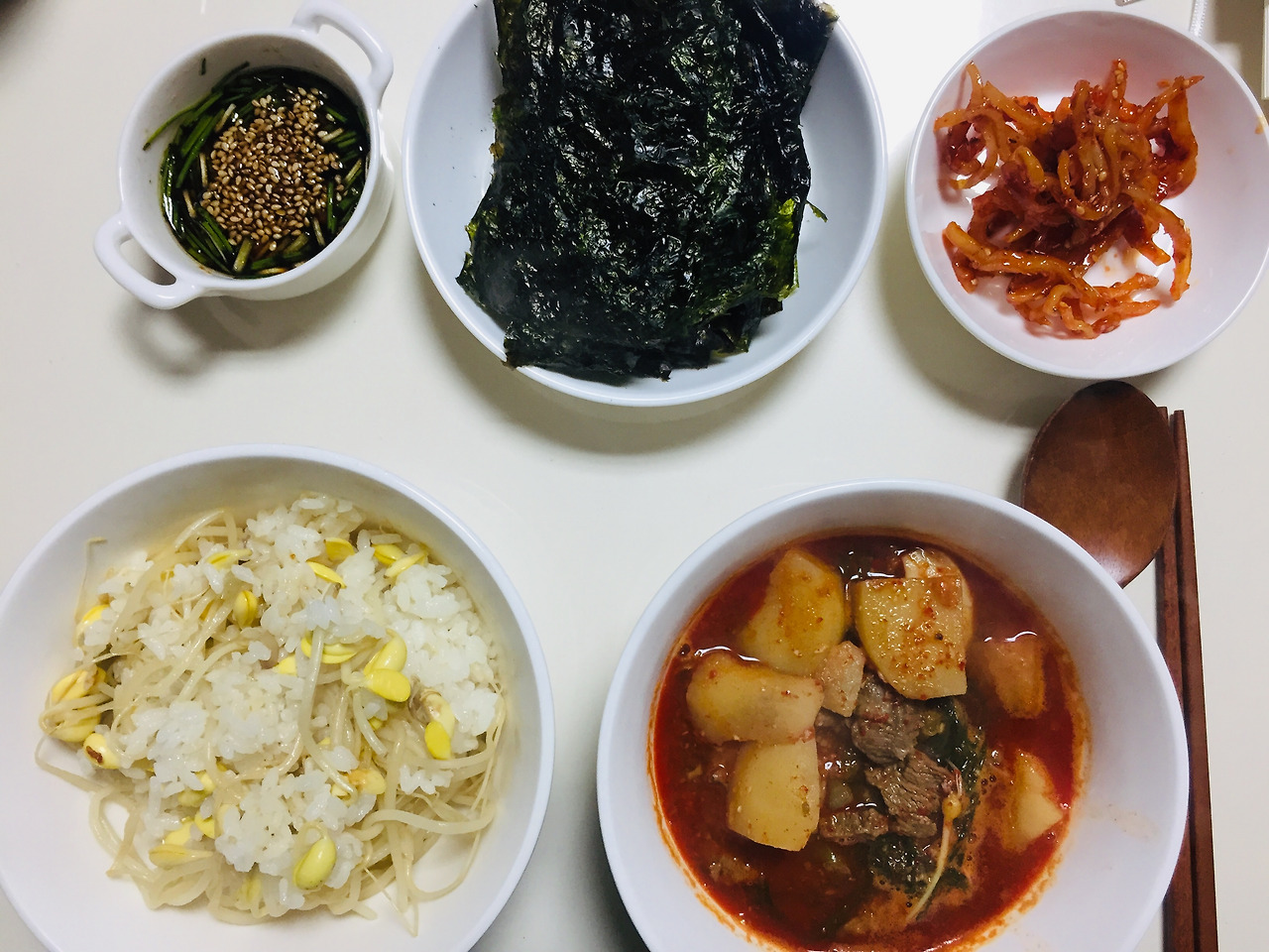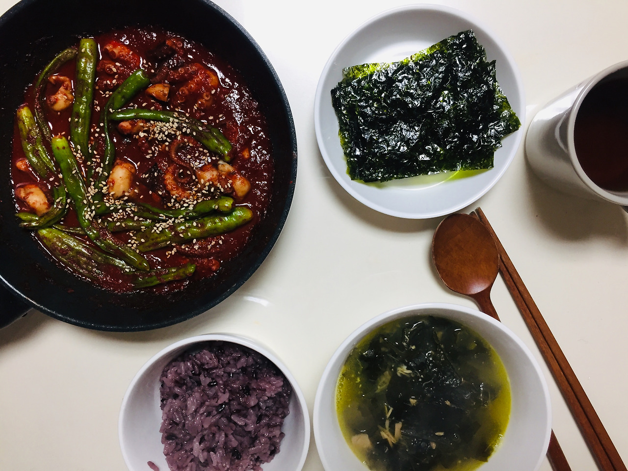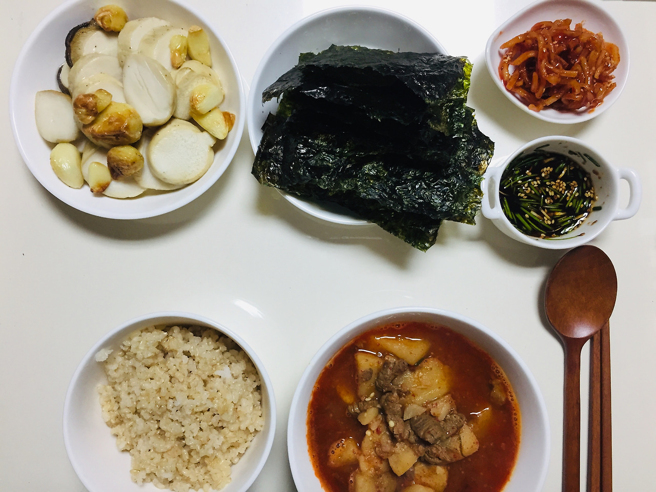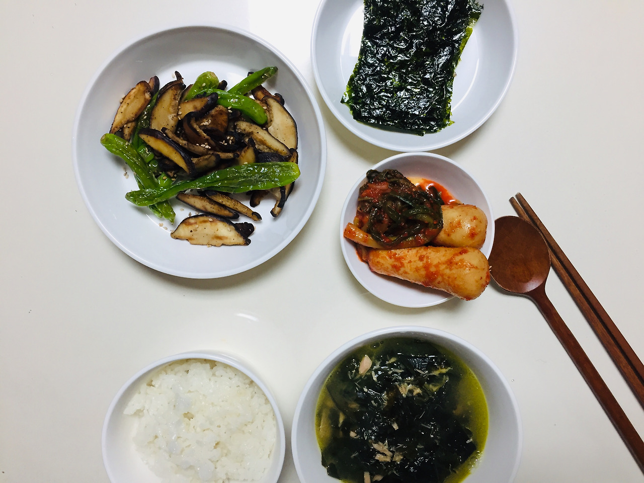 미역국에 동그랑땡이 빠져있죠. 식재료를 버리지 않고 다 먹자는 목표가 있어서 미역국에 동그랑땡을 넣는 무리수를..사실 맛도 없었어요. 저는 전 중에서 동그랑땡을 제일 좋아하지 않아서 이런저런 방법으로 해치우려고 노력을 많이 했습니다.