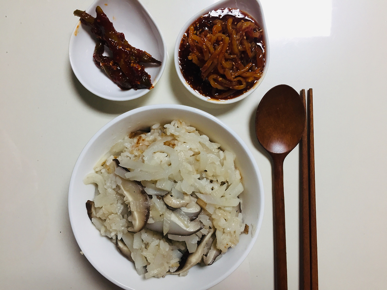 전 표고버섯, 무를 함께 넣어서 밥을 짓는걸 좋아해요. 간장양념이 없어도 충분히 맛있어요. 간단하고도 영양분 가득한 식사여서 종종 해먹습니다.