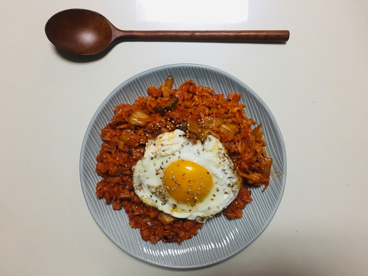 한그릇 음식을 해먹을 때도 많아요. 남은 김치를 다 해치우려고 전날 저녁에 김치볶음밥을 엄청 많이 해서 남았어요. 그래서 다음날 점심에 다시 먹었습니다. 계란은 반숙을 좋아해요. 톡 터트려서 매운 김치볶음밥과 함께 먹으면 참 좋습니다.