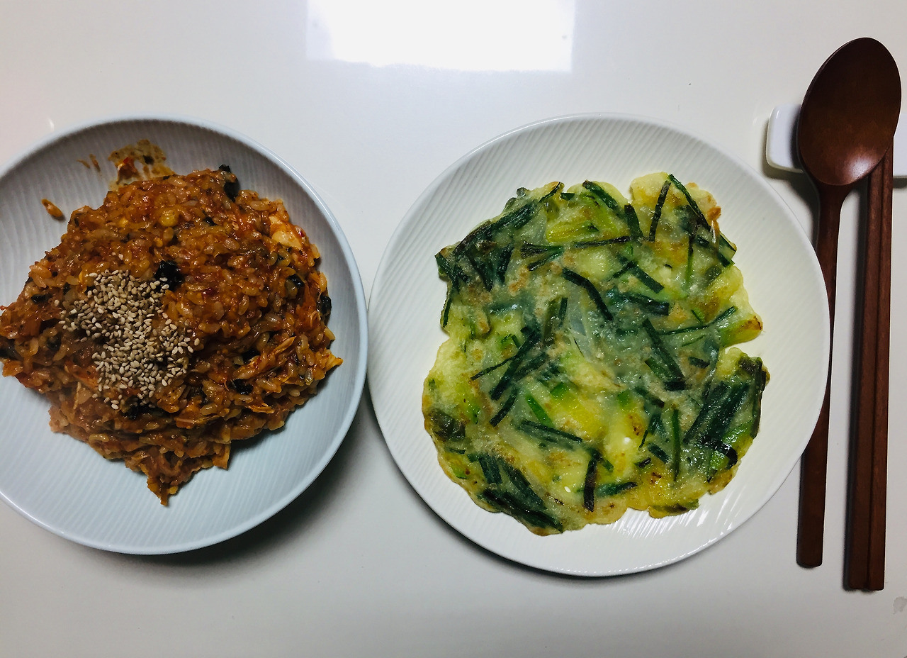 전날 먹은 닭볶음탕 소스에 밥을 볶아서 부추전과 함께 먹었어요. 저는 전을 엄청나게 좋아해서 집에 부침가루나 밀가루를 항상 구비해두고 이런저런 채소를 넣어 해먹어요. 부추도 좋아하는 편이어서 얼마전에 씨를 뿌리고 집에서 기르기 시작했는데, 싹이 트면 좋겠어요.