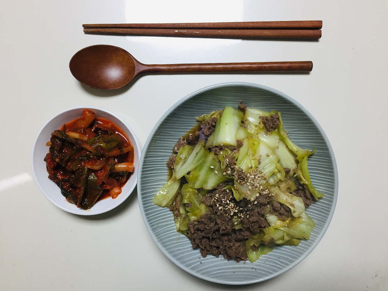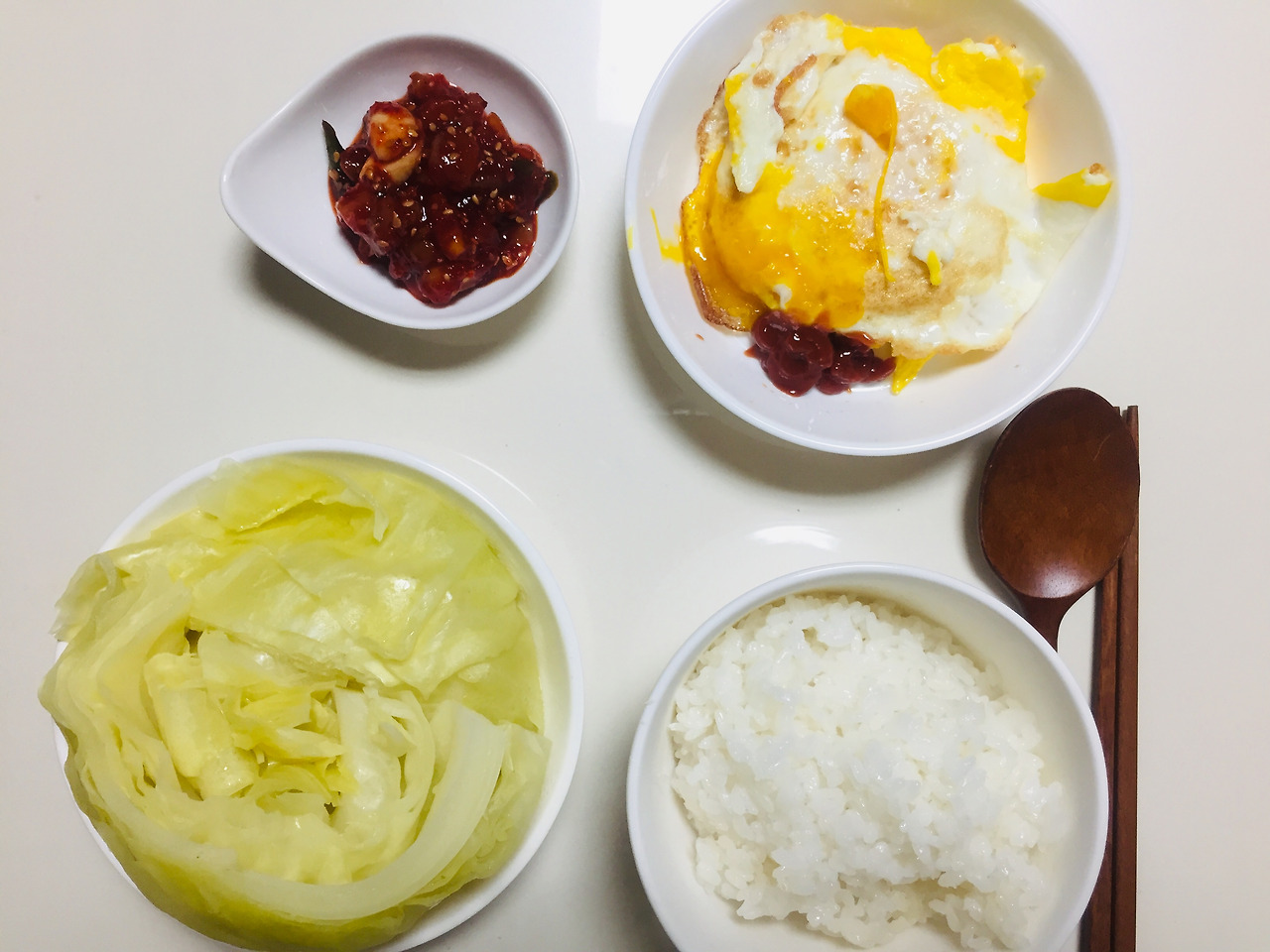 이날 집에 재료가 별로 없었어요. 하지만 대체적으로 냉장고에 있는 양배추를 삶아 계란후라이, 오징어젓갈과 함께 먹었습니다. 지금은 쌀을 바꿨지만 이때는 조선향미를 먹었는데 향이 정말 좋은 쌀입니다. 밥할 때 특히 향기가 어마무시해요.