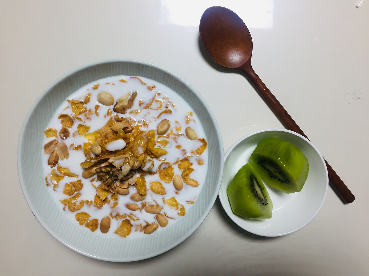 저는 콘프로스트를 정말 좋아합니다. 정월대보름 때 엄마가 보내준 호두와 땅콩을 하루종일 까서 통에 보관해두고, 콘프로스트와 함께 넣어 먹으니 건강한 느낌이 들어 좋았어요. 과일을 자주 먹지는 않지만, 의무적으로 먹으려고 노력합니다. 마트에서 그나마 저렴했던 키위를 사서 한 달은 넘게 냉장고에 두고 먹었습니다. 너무 천천히 익더라구요.