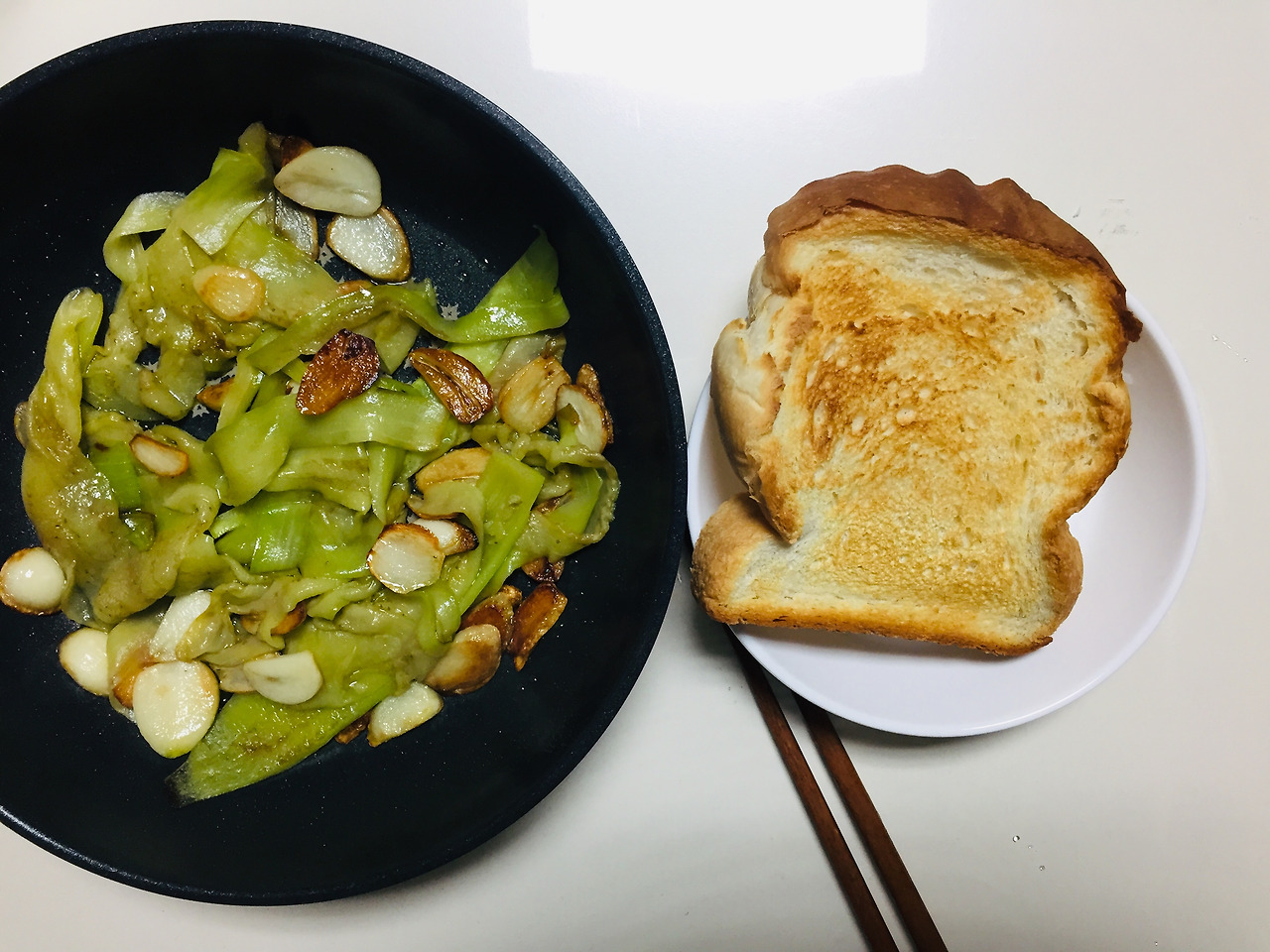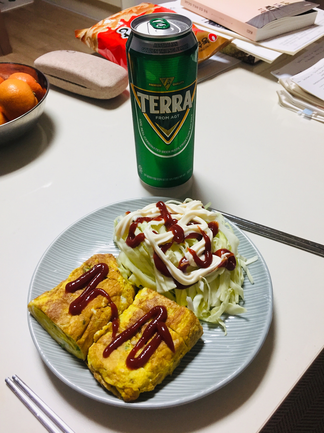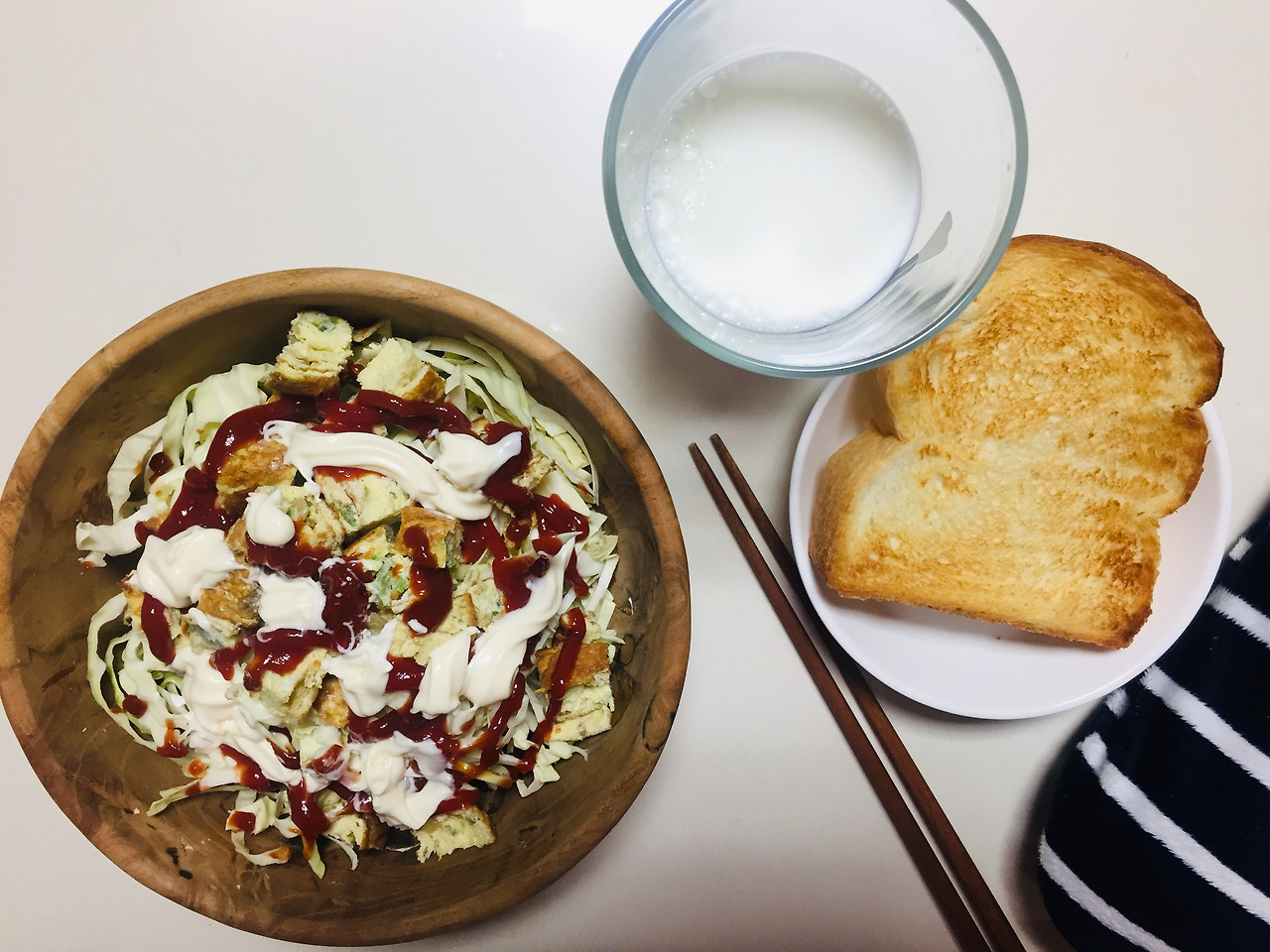 전날 먹었던 음식이 남아서 다음날 아침에도 먹는 경우가 종종 있어요. 전날 계란말이를 해서 케첩과 마요네즈를 뿌린 양배추 샐러드에 곁들여 먹었는데 너무 많아서 남겼습니다. 1인용 음식을 만드는 게 너무 어려워요. 항상 양조절에 실패합니다. 보통은 한끼에 다 끝내려고 하는데, 정 힘들면 그냥 다음날 먹습니다. 역시 빵과 함께 먹으니 꿀맛.