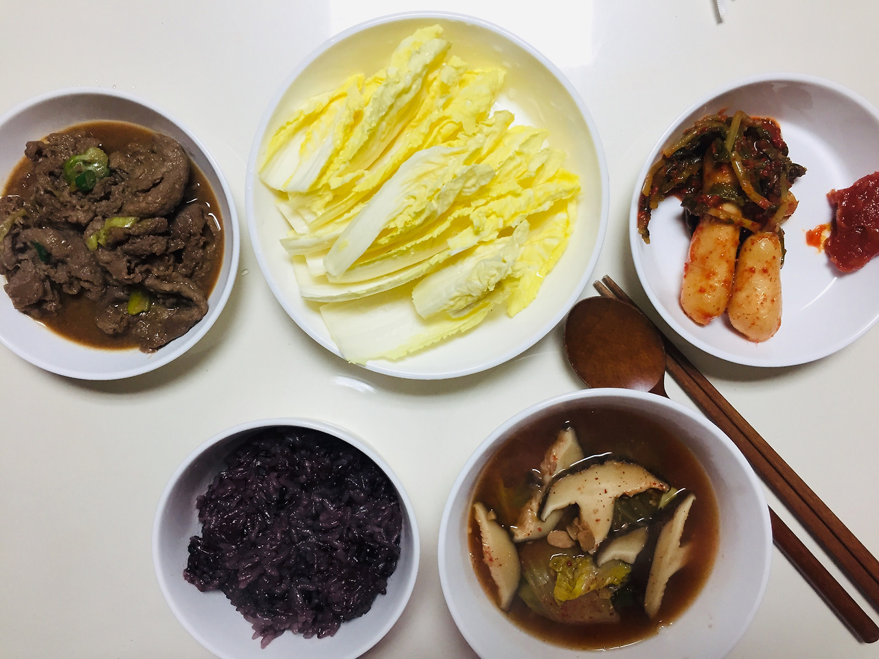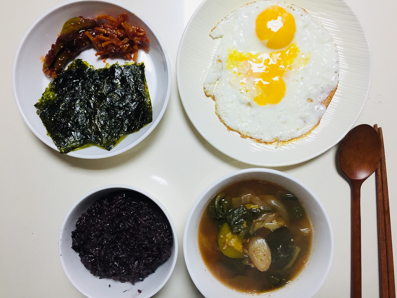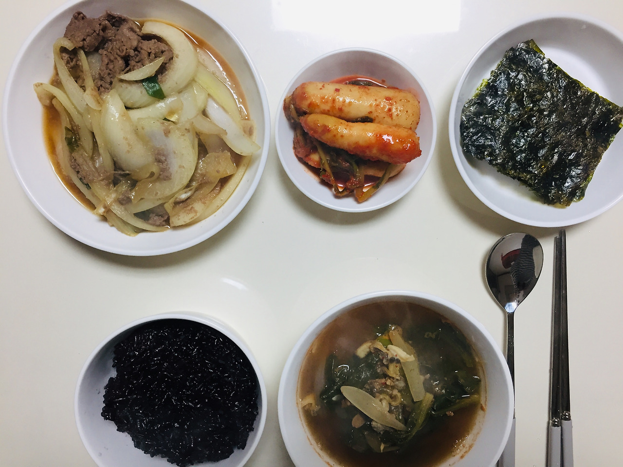 엄마가 명절에 여러 봉지에 소분해서 담아준 불고기를 열심히 챙겨먹었습니다. 김은 아는 언니가 명절 선물로 받았던걸 나누어주었어요. 검은쌀을 너무 많이 넣어 까만 밥이 되었네요. 저는 국을 좋아하는 편이라 자주 끓입니다. 시금치된장국은 저의 최애 국!
