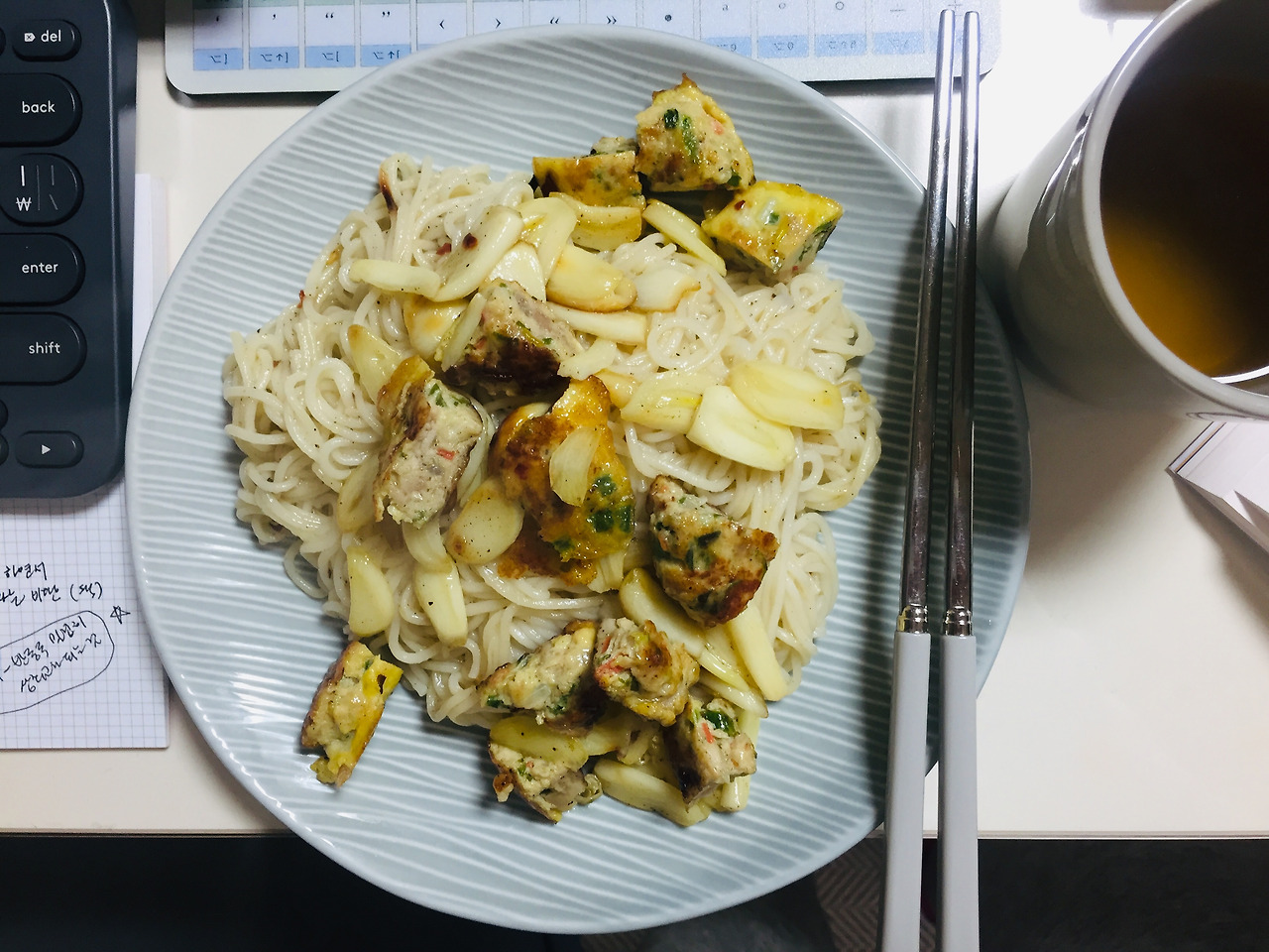 알리오올리오를 좋아해요. 집에 올리브오일만 있으면 쉽게 할 수 있는 요리죠. 근데 파스타면이 없어서 중면으로 해봤어요. 뭐든 면이니까 상관 없겠지라는 생각으로. 전날 내려놓은 밀크티와 함께. 마늘도 듬뿍. 동그랑땡을 넣어주었습니다. 이 요상한 혼종. 그래도 맛은 좋았어요.