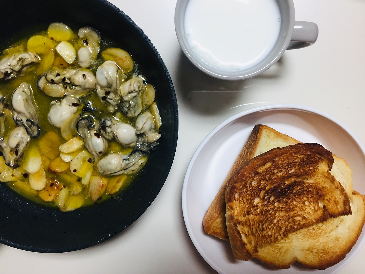 전날 마트에서 굴을 사 신선한 굴밥을 해먹었습니다. 진짜 너무 맛있어서 깜짝 놀랐어요. 굴은 최대한 빨리 먹어야 하는데, 역시 1인 가구인 제가 한 번에 소진하기 어려워 다음날 아침에 바로 해먹었습니다. 올리브오일에 마늘과 굴을 넣어 빵에 올려 먹었습니다. 와, 정말 맛있었어요. 역시 제철음식이 맛이 좋습니다. 올리브오일은 여러모로 쓸모가 많아요. 항상 집에 구비해두면 좋더라구요.