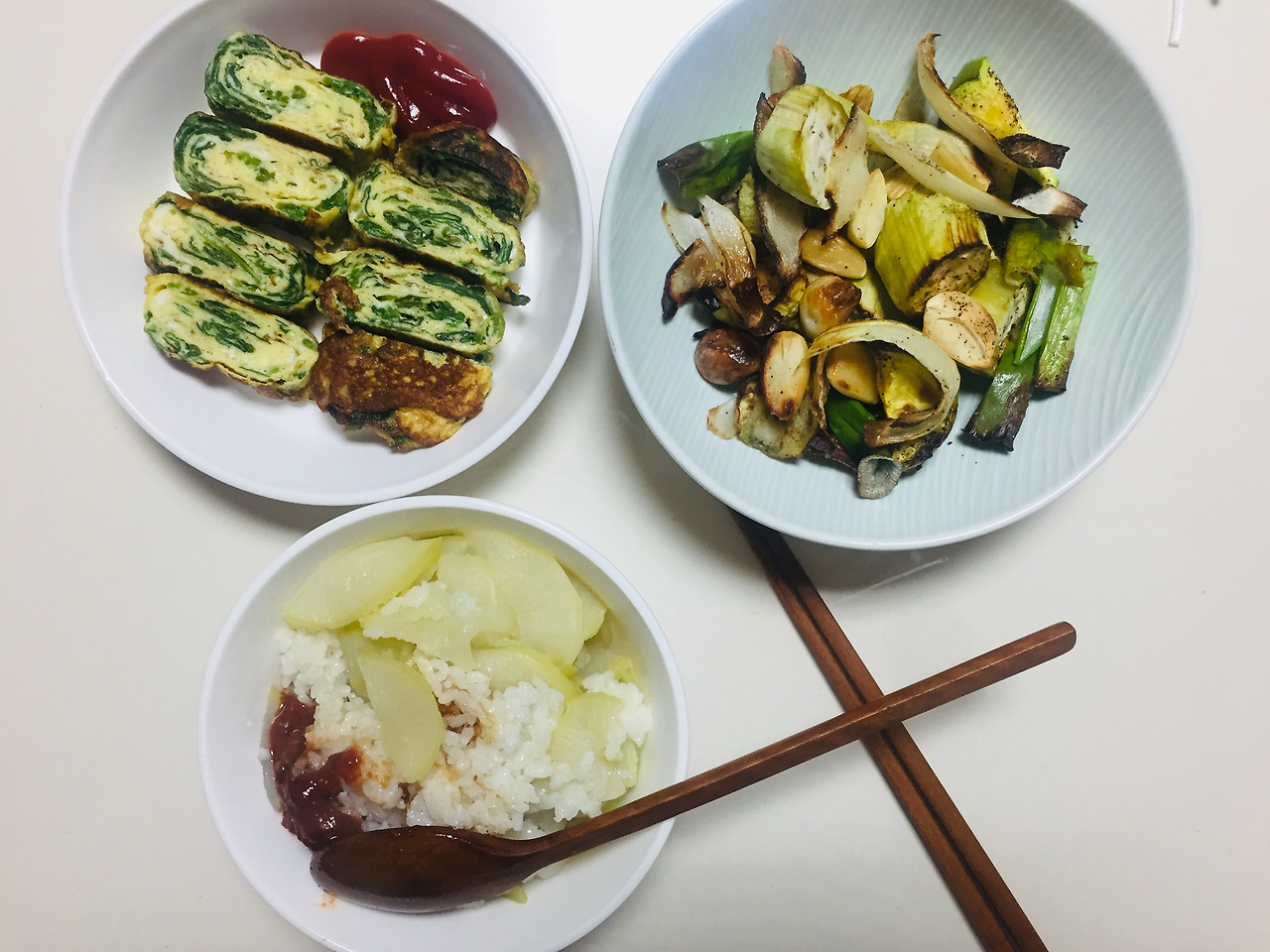 시금치된장국을 해먹었지만, 냉장고에는 여전히 시금치가 가득했습니다. 계란말이 안에 데친 시금치를 넣어 요리했습니다. 아주 미세한 시금치 맛이 나면서 부드러움까지 더해져 좋았어요. 가지, 마늘, 파, 양파 등을 에어프라이어에 돌려 먹었는데 정말 맛이 없었습니다. 뭐가 잘못된 걸까요. 밥은 무밥. 저는 무밥을 정말 좋아해요. 무밥에 고추장 쓱쓱 비벼 한끼 했습니다.