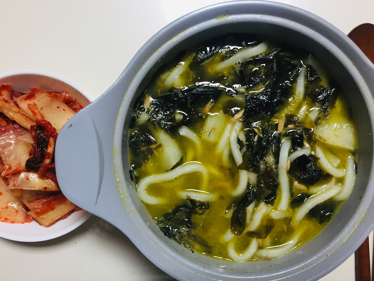 미역국을 정말 좋아한다고 앞에서 말했었죠. 병원에 입원했을 때 <멜로가 체질>을 봤는데, 거기에서 미역국에 라면사리를 넣어서 해먹더라구요. 저도 혹해서 한 번 해보았습니다. 푹 익은 김치와 함께 먹으니 넘나 맛있는 것.