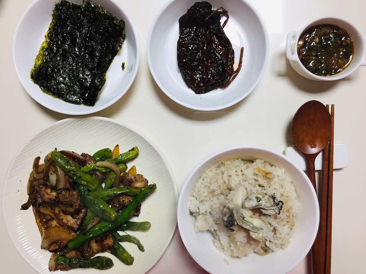 정말 환상이었던 굴밥. 삼겹살에 꽈리고추와 양파까지 넣어 후추 왕창 뿌려서 볶았습니다. 이 조합은 정말 사랑입니다. 저는 생굴은 잘 먹지 않는데, 이렇게 익혀 먹으니 매일매일 먹을 수 있을 것 같았어요.