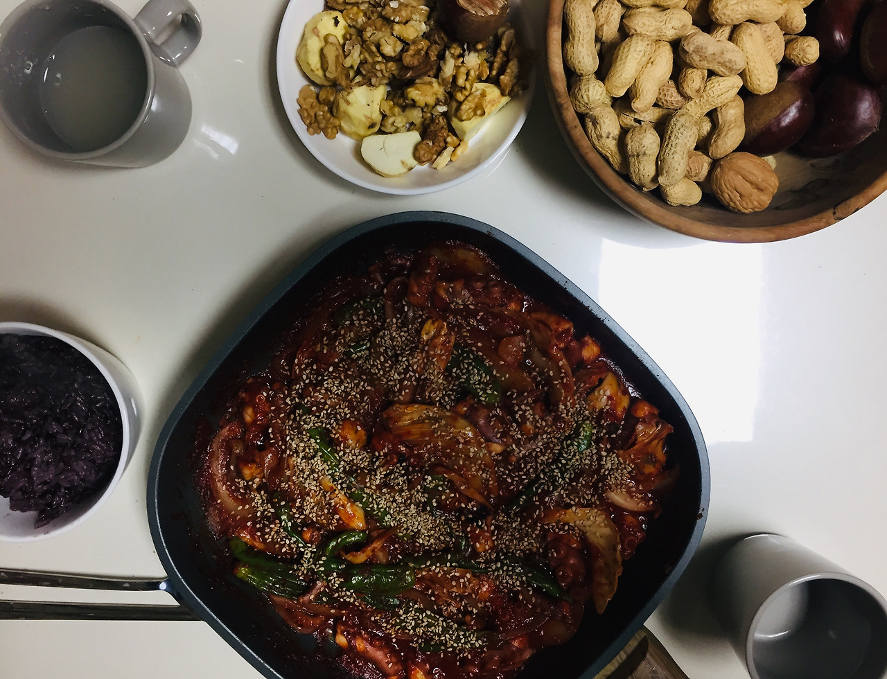 정월대보름 기념으로 먹었던 낙지볶음입니다. 역시 꽈리고추를 넣었어요. 이 때는 양파도 있어서 함께 먹었어요. 처음으로 해본 낙지볶음이었는데 맛있어서 놀랐어요. 요리는 이렇게 막 해도 되는 거였어요.