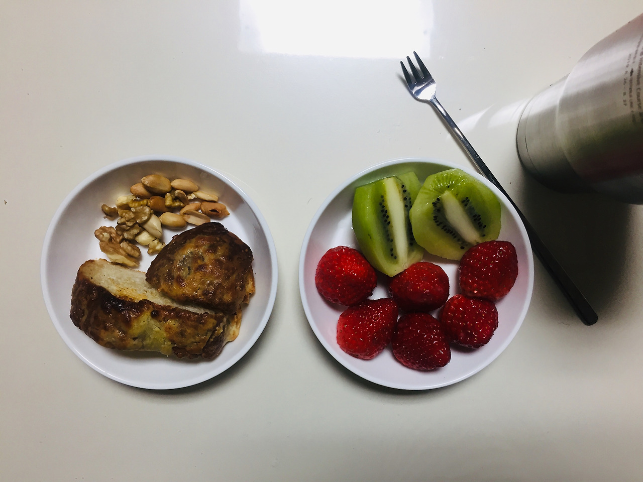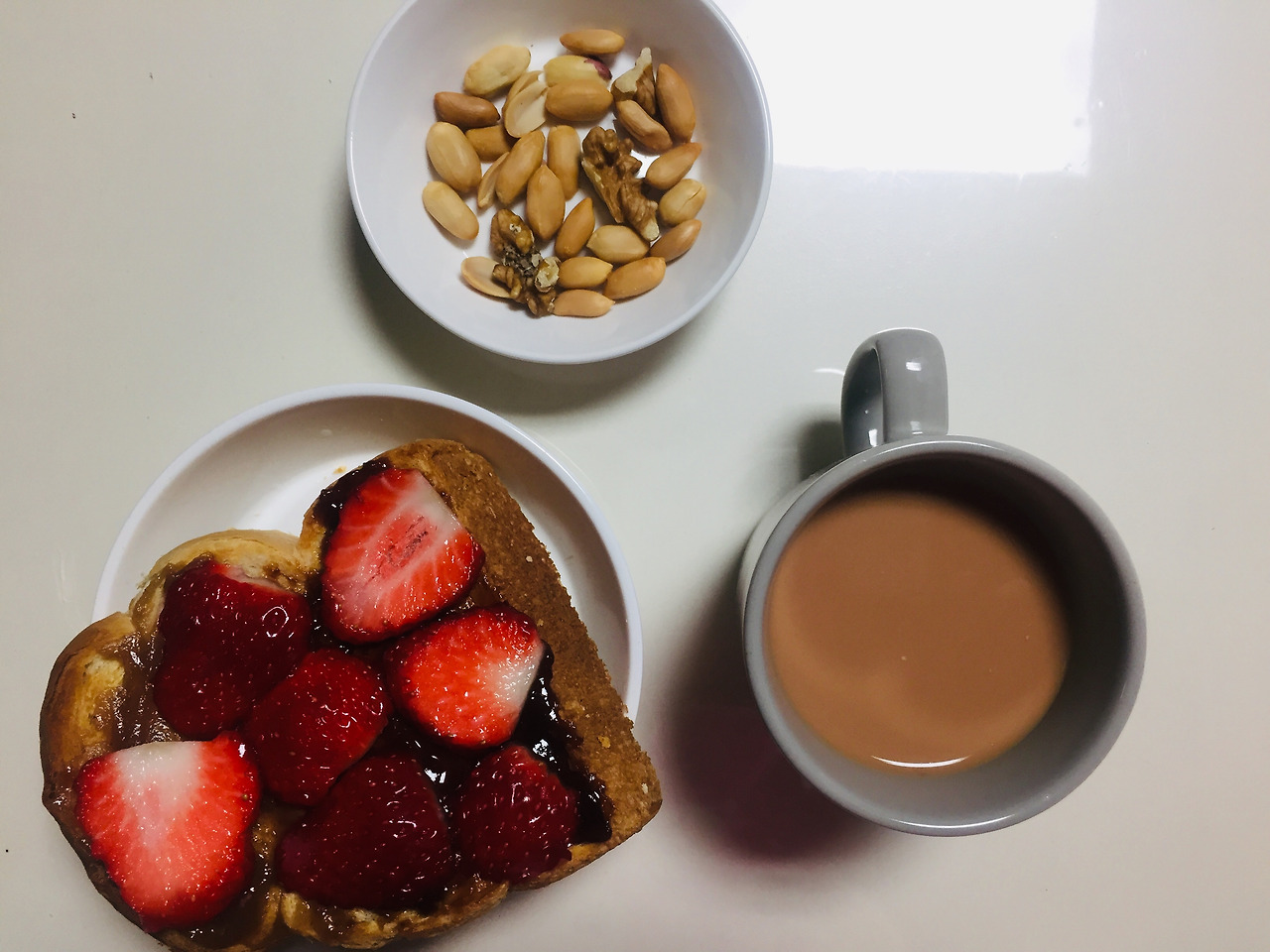홍콩에서 친구들이 보내준 밀크티를 전날 미리 내려두었습니다. 냉장고에 차게 보관해서 3일 동안 나누어 먹었어요. 아, 빵은 동네 산책하다가 발견한 유기농 빵집에서 사본 식빵인데, 저는 입맛이 까다롭지 않아서 일반빵과 큰 차이를 모르겠더라구요. 하루 종일 까서 보관해둔 땅콩과 호두를 딸기잼과 딸기를 듬뿍 올린 빵과 함께 먹었습니다.