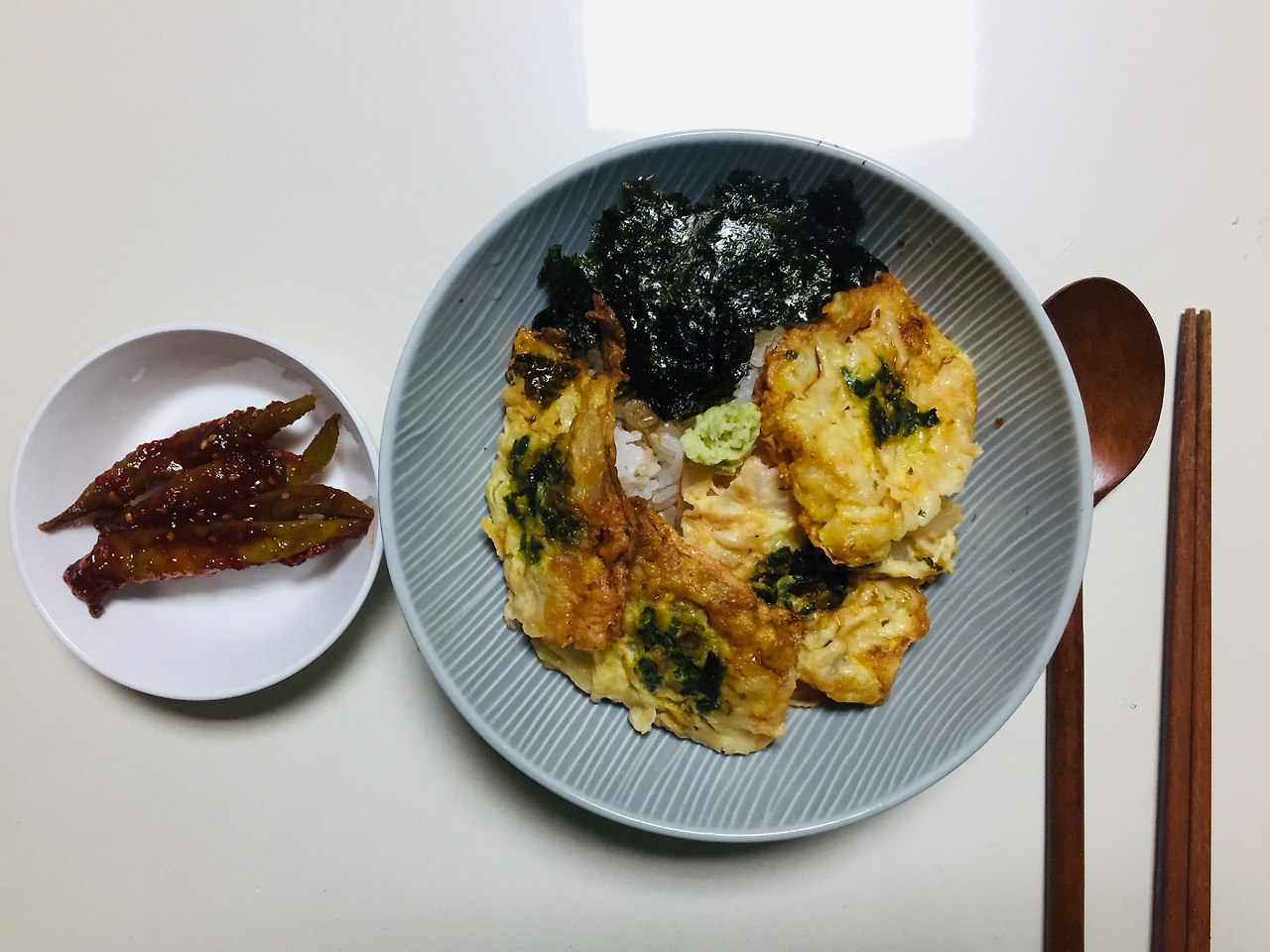 남은 새우전으로 어떻게 맛있는 밥을 해먹을 수 있을까 고민하다가 덮밥을 생각해냈어요. 에어프라이어에 새우전을 데우고, 밥에 간장을 뿌리고 그 위에 생 와사비를 두었는데요. 김가루도 넣고. 근데 생각보다 싱거워서 간장을 더 쳤어요. 나름 괜찮았지만, 굳이 다시 먹고 싶지 않은 맛이었어요.