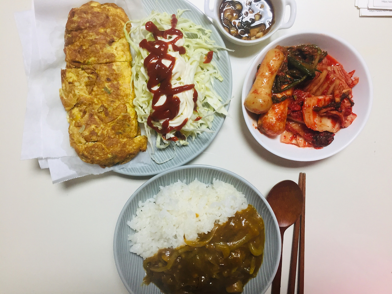 거대한 계란말이. 제 기억엔 계란을 4-5개 넣었던 것 같아요. 거기에 카레까지. 3분 카레이기는 하지만, 양파를 좋아해서 양파를 먼저 볶아 글레이즈드 한 뒤에 카레를 넣어주었어요. 그러면 풍미가 살아납니다. 새콤한 김치까지 함께 하니 너무너무 좋았던 한끼였습니다.
