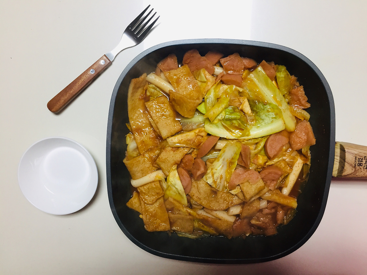 최근에 친구들이 집에 와서 종종 밥을 먹는데, 떡볶이를 하게 되었어요. 재료가 남아서 혼자 해먹었습니다. 네 1인분입니다. 어묵 2장에 분홍소시지 손가락 한마디 정도, 떡 아주 조금만 넣었는데 엄청 많아졌어요. 저는 떡볶이에 분홍소시지를 넣어 먹는걸 정말 좋아해요. 그 식감이 특이해서 좋다고 해야할까요.