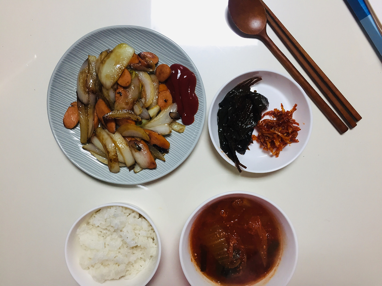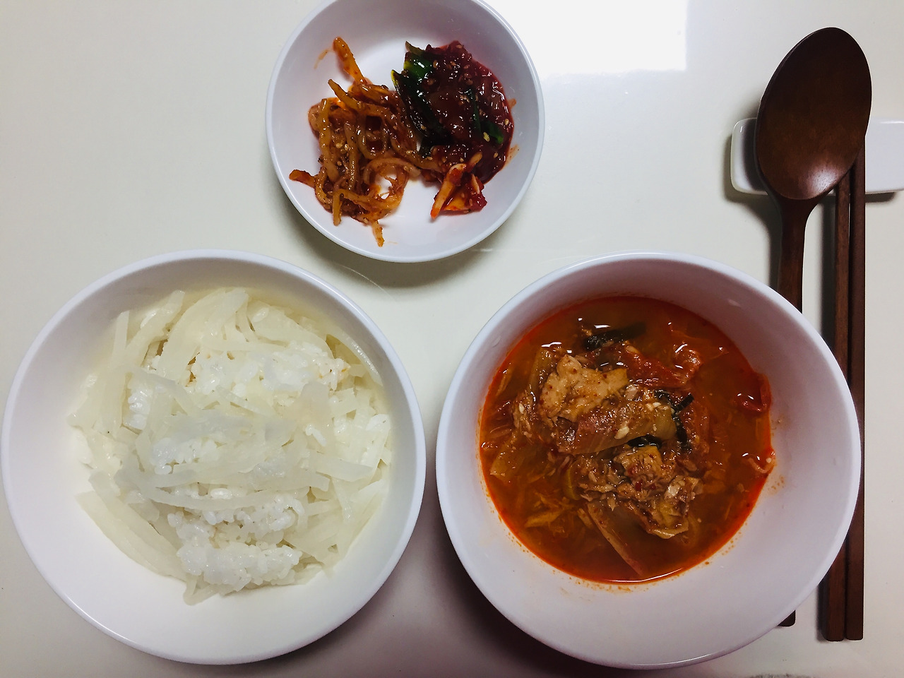 무밥에 김치찌개인 것 같아요. 역시 전을 넣은 것 같네요. 아마 동그랑땡이었을 것 같은데. 버리기 싫어허 억지로 먹은 동그랑땡. 맛은 별로였던 기억이 나요.