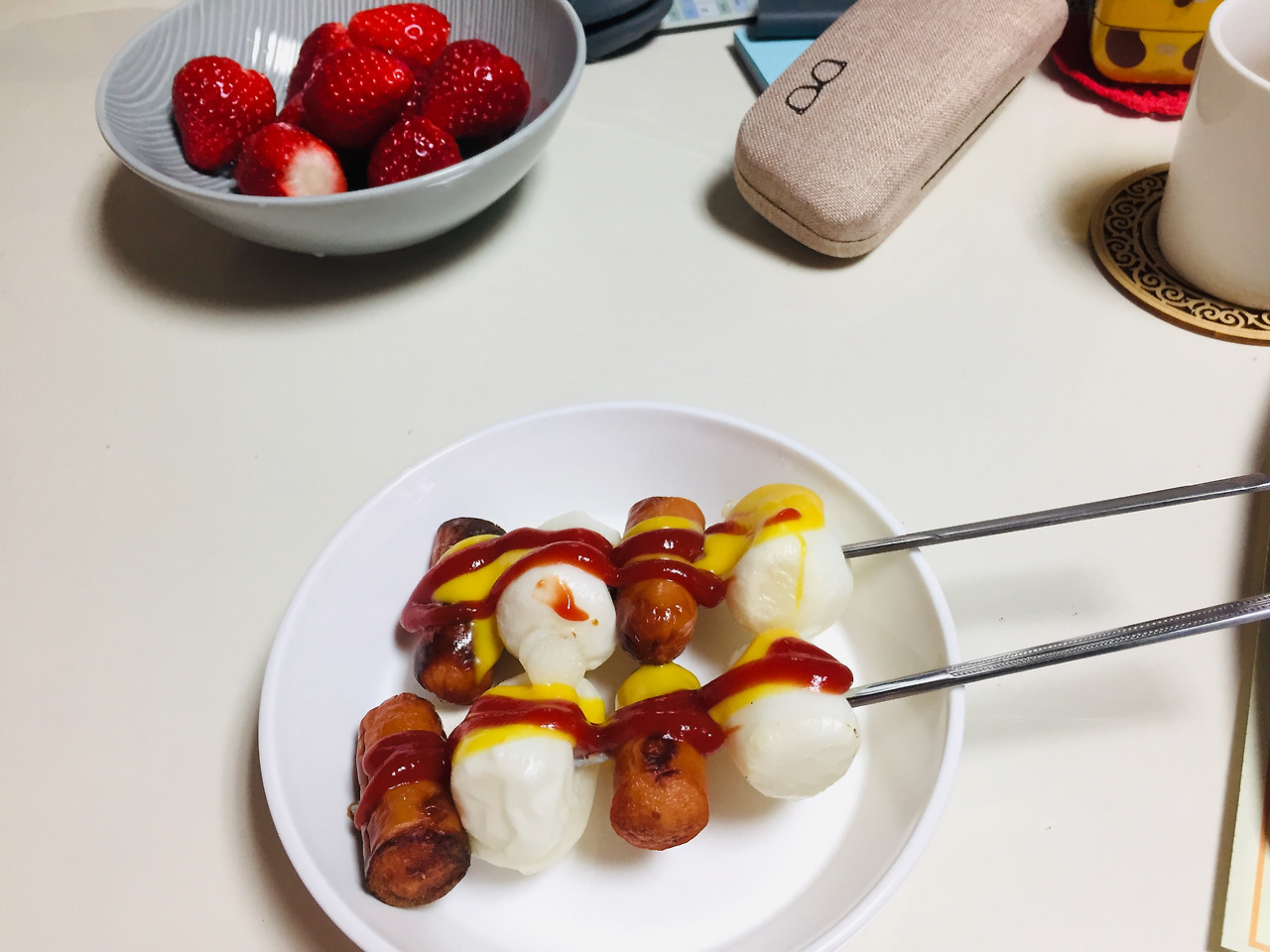 마트 가서 가래떡과 소시지를 보고 소떡소떡을 먹고 싶다는 생각이 들어서 샀어요. 에어프라이어에 구워서 젓가락에 끼우고 허니머스타드와 케첩만 뿌려주면 끝나요. 완전 간단한데 맛은 정말 최고.