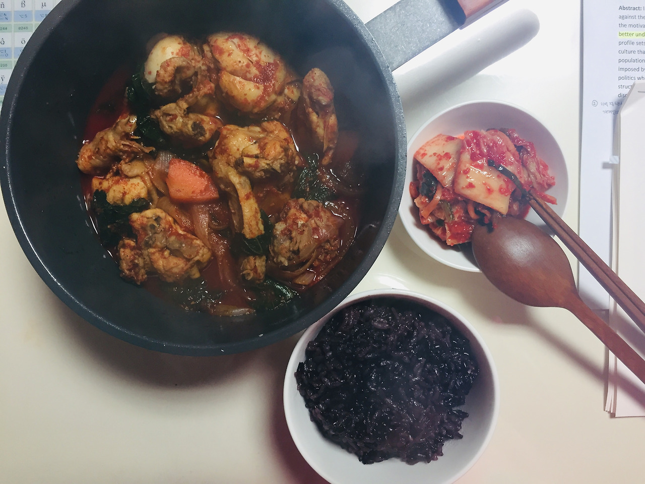 닭볶음탕은 제가 자주 해먹는 음식 중 하나입니다. 책상을 식탁 겸 써서 지저분한 배경이네요. 근데 저 때는 닭에 양념이 잘 스며들지 않고, 닭에서 냄새가 조금 나서 별로였던 기억이 있어요.