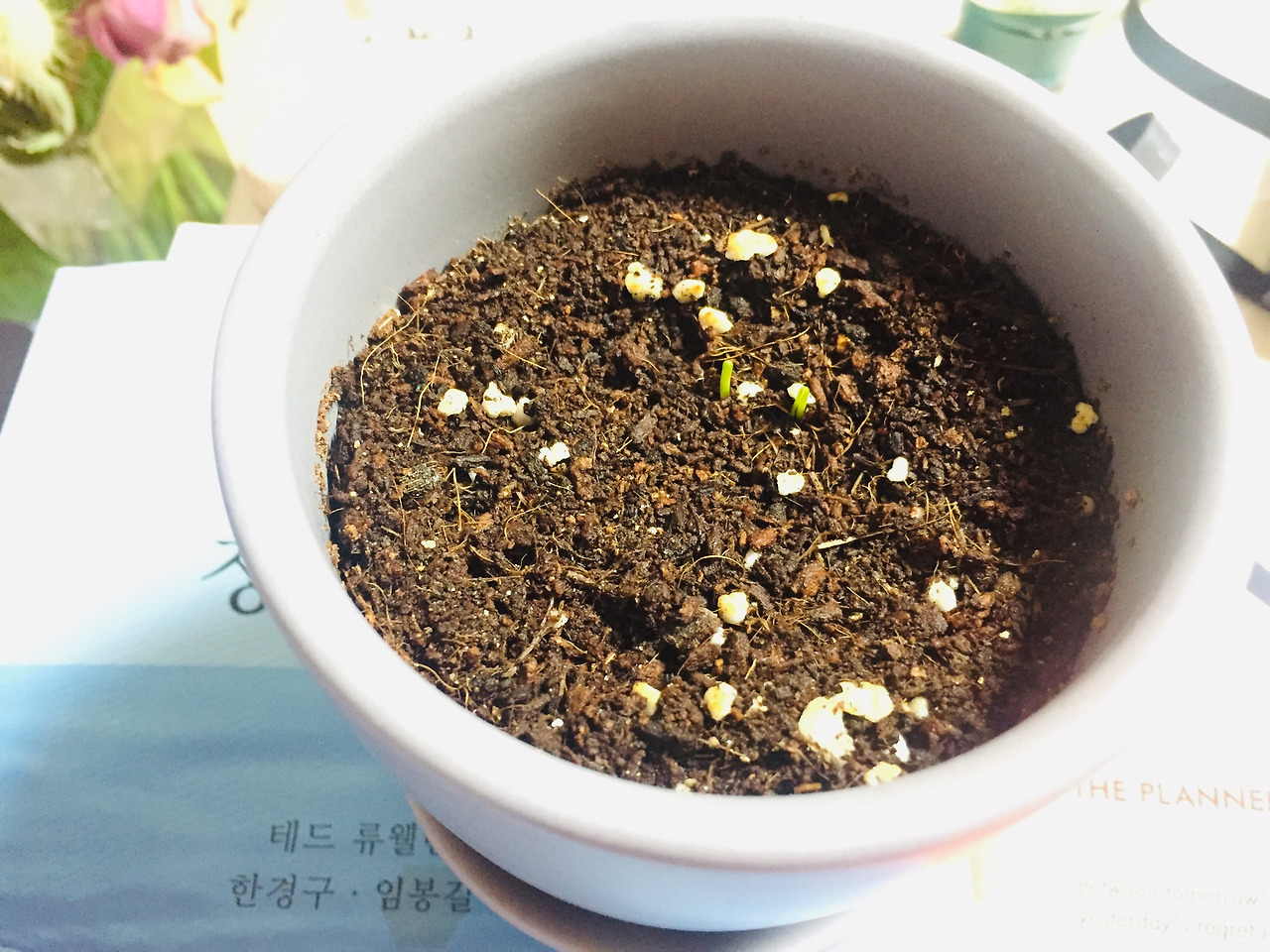 3.18 / 얼핏 본 화분에 두 개의 초록 싹이 자라나고 있었다. 곰팡이가 핀 바질 씨앗에 신경을 쓰느라 보지 않았던 부추 화분에서 싹을 발견했을 때의 기쁨이란. 소리를 지르며 좋아했다. 으아. 부추는 살았어. 이런 느낌이랄까.