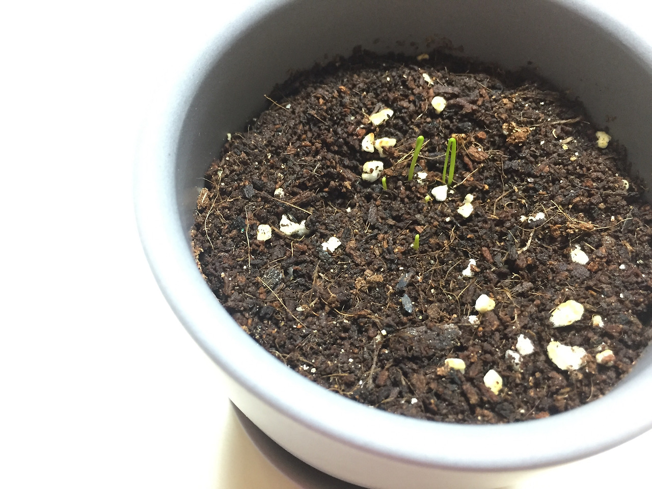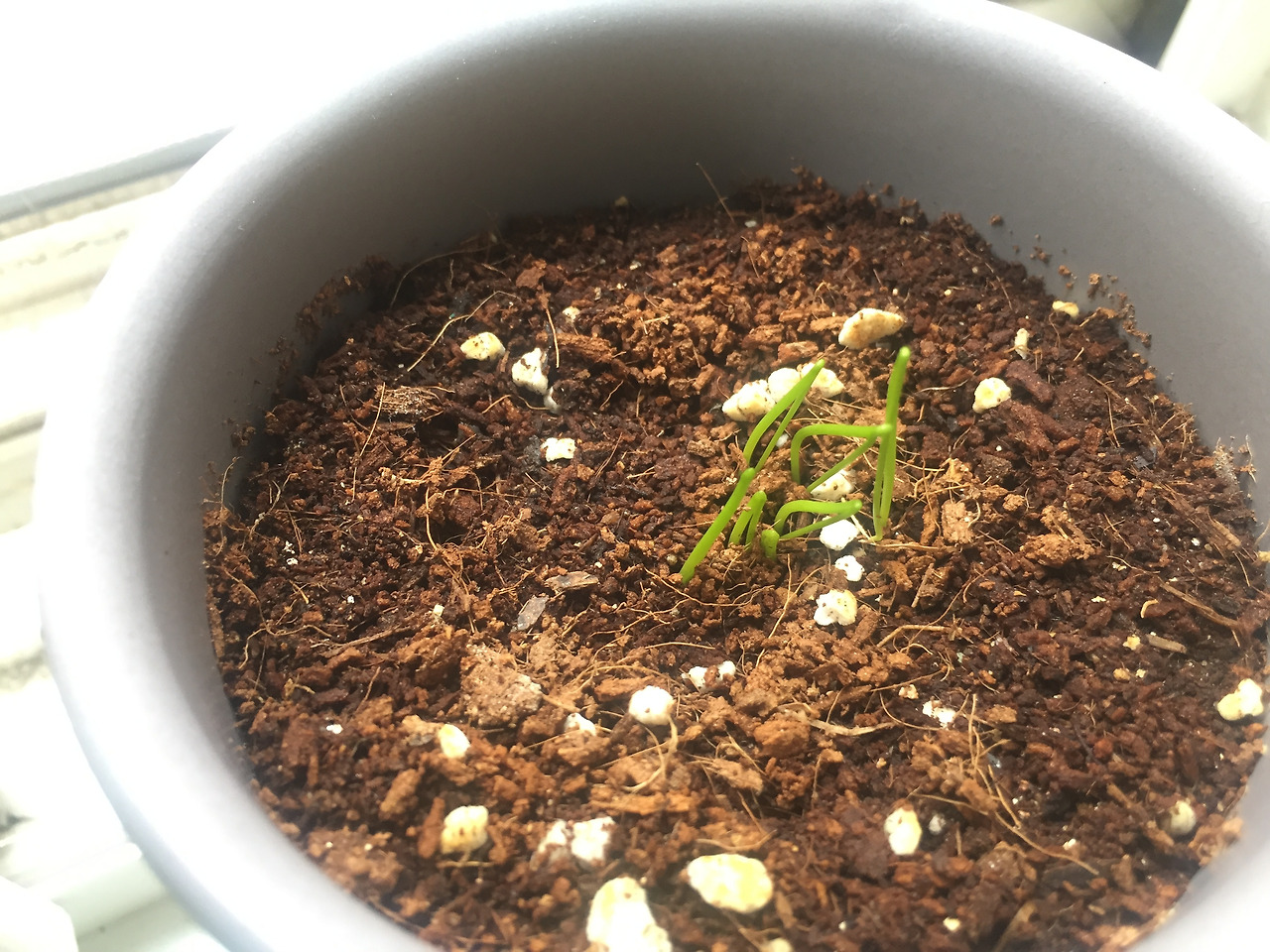 3.21 / 또 다음날. 하나가 더 났다. 제일 작은 싹이 새롭게 등장. 도대체 왜. 내가 7개를 심었나. 어쨌든 계속 뭐가 나왔고, 모든 싹은 2겹으로 되어 있었다. 2중의 겹 사이가 벌어지기 시작했다. 부추를 처음 키워보는 거라 신기했다. 벌어지면 어떻게 되는 거지?
