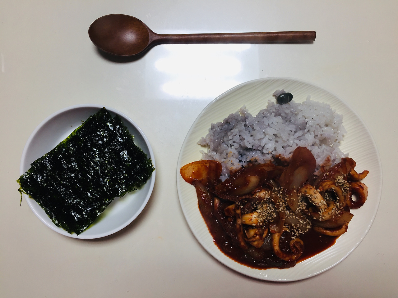 오징어볶음을 해서 덮밥으로 먹었다. 냉동실에 오징어를 보관해두고 먹고 싶을 때마다 미리 해동해서 먹는다. 양파를 잔뜩 썰어 고추장+고춧가루 진간장, 올리고당, 간마늘, 매실 등으로 양념해 먹었다. 많이 짜지 않아서 김과 함께 먹어도 부담이 없었다.