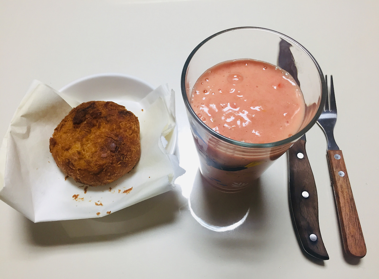저번에 토마토에 아무것도 넣지 않고 갈았더니 너무 셔서 꿀을 넣었다. 엄마가 주었던 밤꿀을 조금 넣었더니 완전 맛있었다. 빵은 김치고로케. 냉동실에 넣어두었던걸 해동시키지 않고 에어프라이어에 구었는데 표면이 너무 딱딱해져서 먹기 어려웠다. 에어프라이어 만능주의를 버려야겠다.