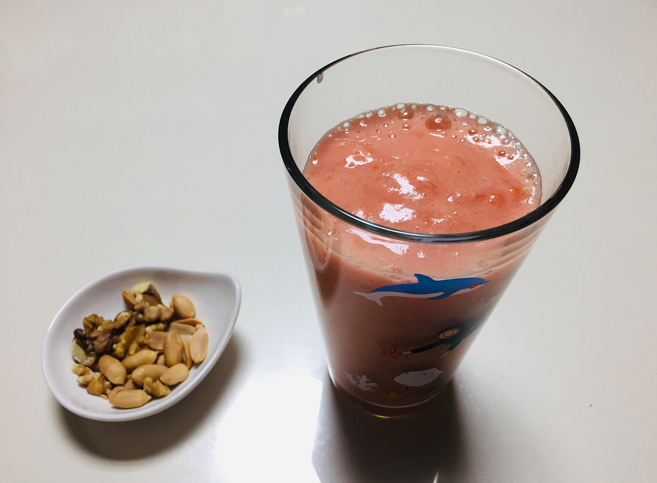 친구가 선물로 보내준 믹서기에 완숙 토마토 세개를 갈았다. 꿀을 넣지 않았더니 시었다. 토마토 본연의 맛. 생각보다 꾸덕꾸덕해서 컵을 완전히 기울여야만 먹을 수 있었다. 여전히 냉장고에 보관되어 있는 정월대보름 견과류와 함께 먹었다.