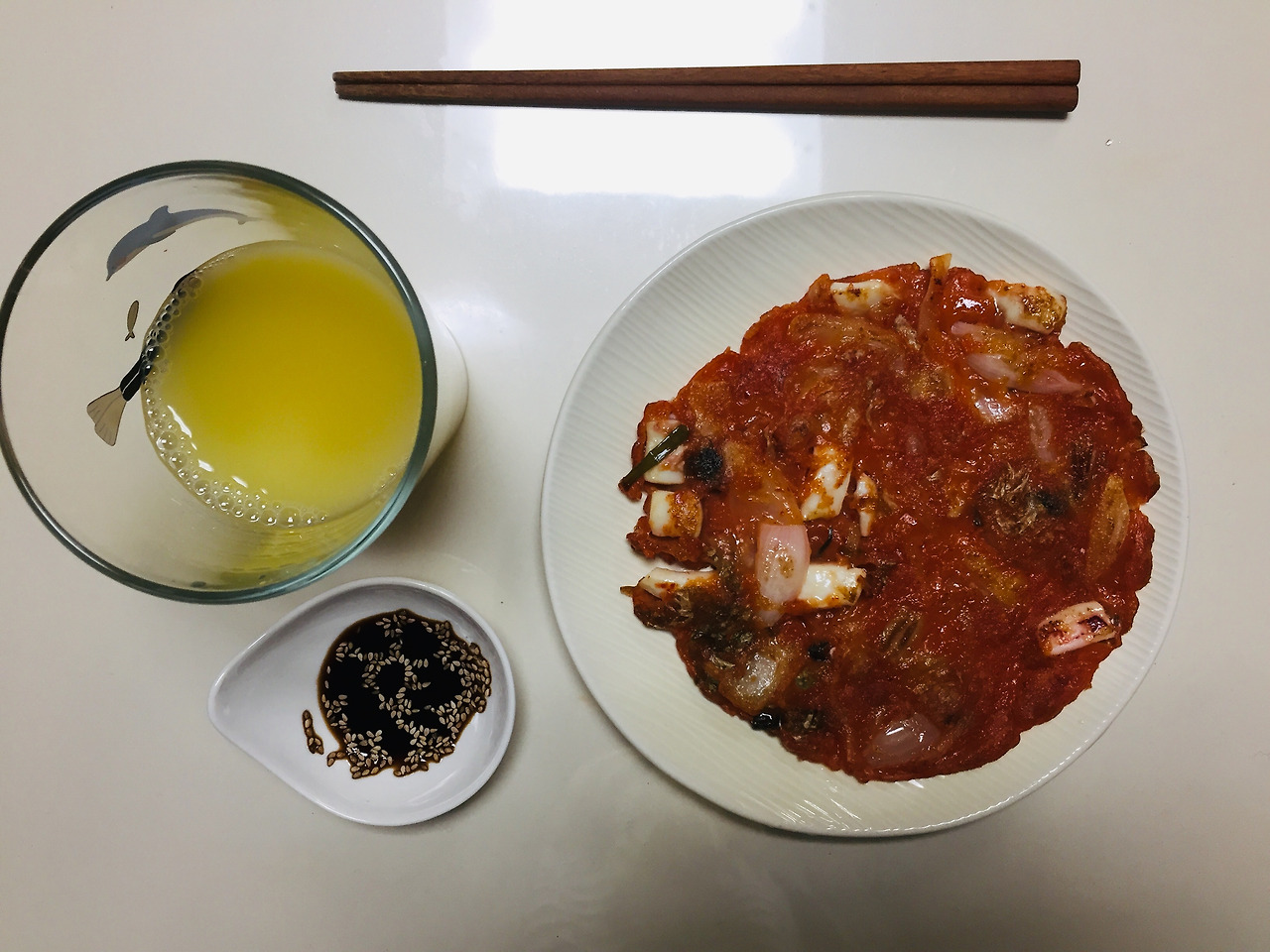 전날 새벽에 친구들이 집에 갑자기 놀러왔다. 급히 만들어낸 안주, 김치전. 냉동실에 오징어가 있는걸 깜빡하고 친구들에게는 그냥 김치전을 해주고 말았다. 다음날 점심에 홀로 오징어를 넣어 다시 부쳐 먹었다. 무주 반딧불이 사과즙을 함께. 예전에 무주산골영화제에 갔을 때 시음해본 적이 있는데, 맛있었던 기억이 있어서 구입했다.