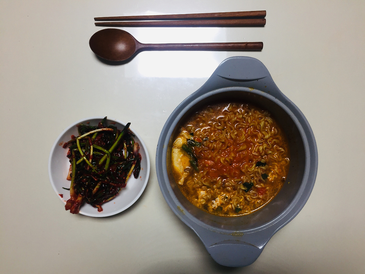 또 라면. 주 2회 라면은 정말 드문일인데. 그걸 이번주에 해냈다. 누워있다가 라면과 파김치를 먹고 싶다는 생각에 벌떡 일어나 끓였다. 이번에는 신라면. 계란은 풀지 않는다. 톡, 떨어뜨린 그자리에 그대로 두면 자연스러운 반숙이 된다. 엄마 파김치가 너무 맛있어서 항상 먹는다. 익지 않은 파김치를 좋아하기 때문에 먹는 속도가 더 빠르다.