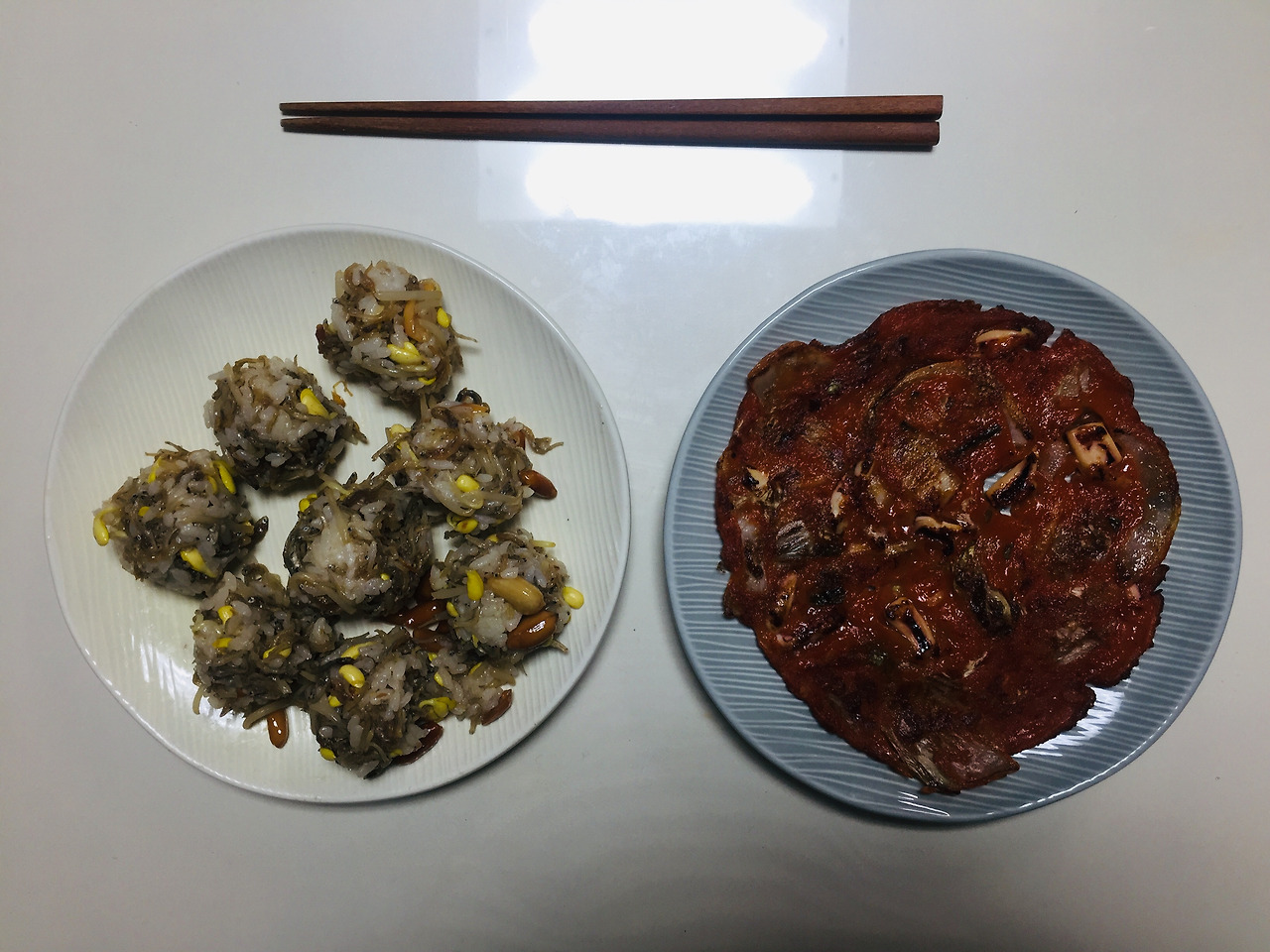 멸치볶음을 너무 많이 했다. 콩나물도 여전히 남았다. 멸치볶음은 오래 두고 먹을 수 있기는 하지만, 난 이상하게 한 번 한 음식을 오래 냉장고에 두고 싶어하지 않아서 빨리 먹고 싶었다. 멸치볶음과 데친 콩나물을 조물조물해서 주먹밥을 만들었지만 잘 뭉쳐지지 않았고 조합도 별로였다. 그래도 꼭꼭 씹어서 다 먹었다. 김치전 반죽이 여전히 남아 있어 또 먹었다.