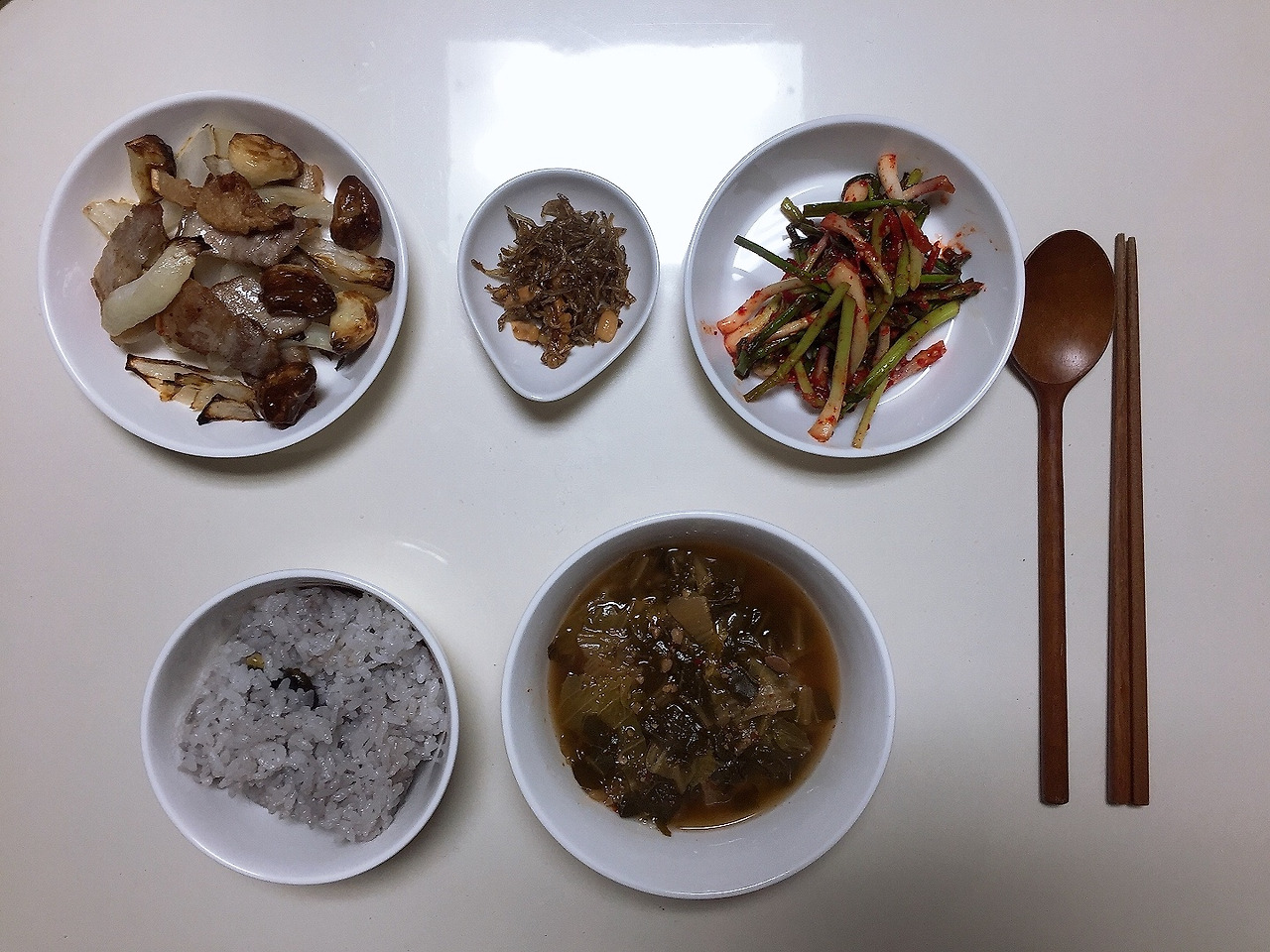 삼겸살이 딱 한 줄 남았다. 에어프라이어에 양파, 통마늘을 함께 넣어 구웠다. 그런데 에어프라이에어 고기를 굽는건 역시 내 취향이 아니다. 겉바속촉이라고 좋아하는 사람들도 있지만, 겉이 지나치게 딱딱해지는 경향이 있다. 이날은 냉동실에 꽤 오랜 시간 살았던 잔멸치를 꺼내 정월대보름 견과류를 몽땅 넣어 볶았다. 맛있었다. 간단한 밑반찬. 역시 냉동실에 있던 시래기로 된장국.