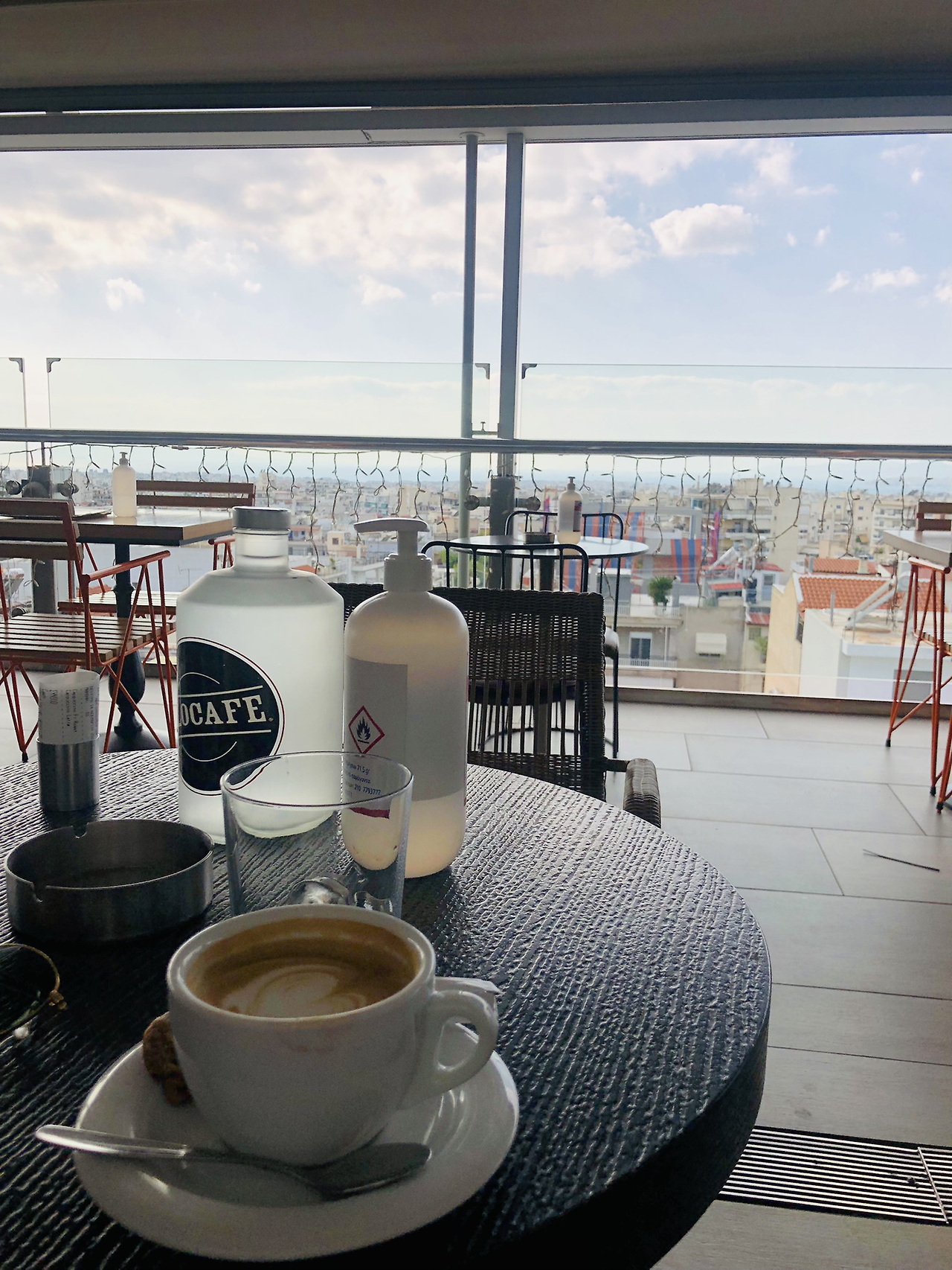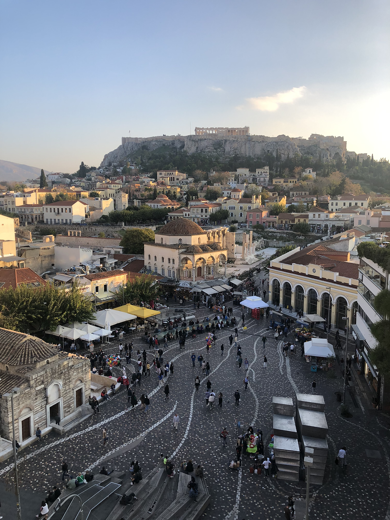 또 하루는 오랜만에 시내 한복판으로 외출을 했다. 신타그마에서 모나스티라키까지 걸었다. 시내에 나온 김에 집에 똑떨어진 커피콩도 샀다. 언제 볶았냐고 했더니 볶은 지 4일 됐단다. 만족스러운 구매에 기분이 좋아진 걸까. 좀 더 걸었다. 모나스티라키 광장은 곡선으로 이루어진 바닥이 건물과 조화를 이루며 아기자기한 분위기를 만든다. 광장 옆 루프탑 카페로 올라가니 모나스티라키 광장에서 아크로폴리스까지 이어지는 풍경이 오후 4시의 햇살을 머금고 반짝였다.