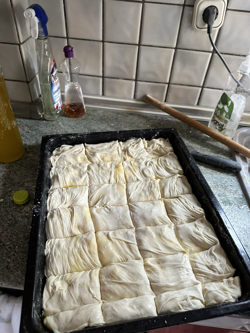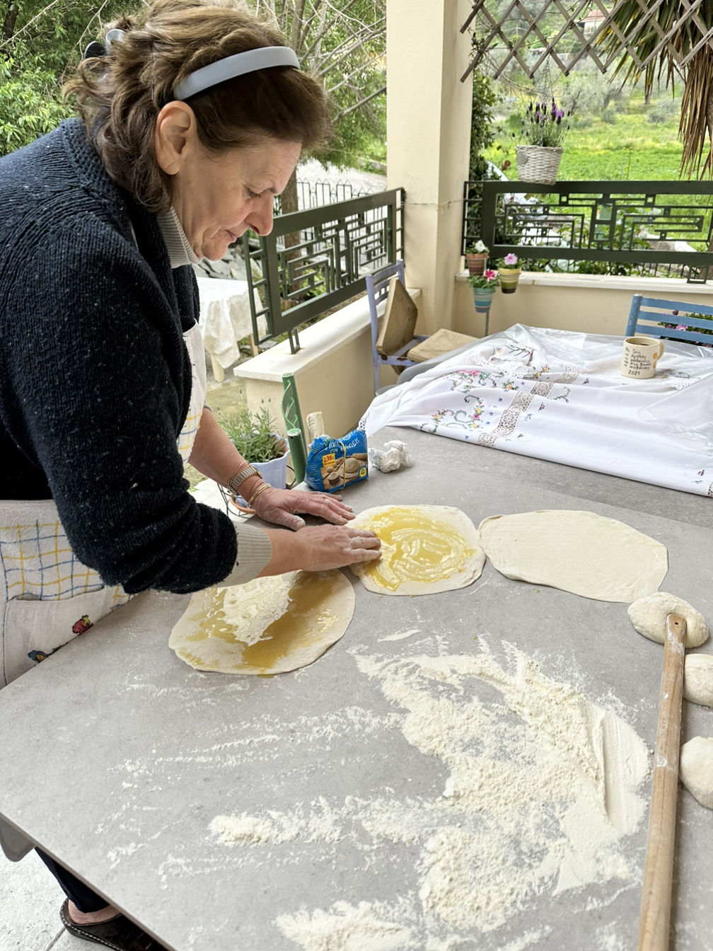 고기 굽기 담당은 큰오빠 몫이었다. 아침부터 계속 그릴 옆에 붙어 앉아 불을 조절하면서 정성스레 고기를 구웠다. 고양이들도 고기 굽는 냄새에 이끌려 오밀조밀 모여들었다. 고기가 구워지는 동안 이사벨라의 어머니는 치즈 파이(띠로 피타)를 만드셨다. 밀가루 반죽 안에 치즈를 넣어 오븐에 한 시간 정도 구워내는데 맛이 일품이다. 이사벨라는 옆에서 밀가루반죽을 입힌 페타치즈를 올리브기름에 튀겨냈다. 튀긴 페타치즈에 꿀과 깨를 뿌리면 완성이다. 단짠단짠 + 바삭한 조합이 훌륭했다.