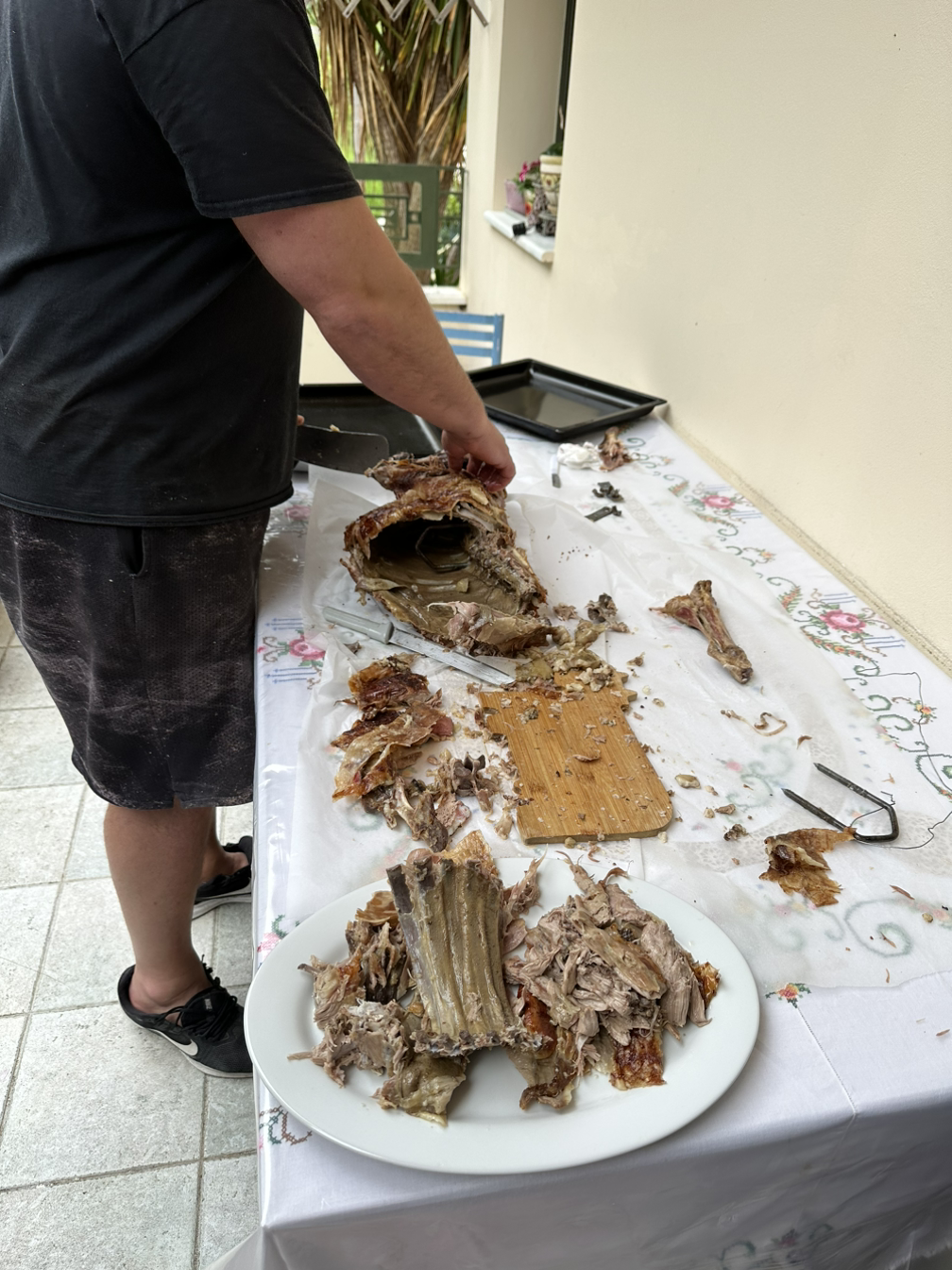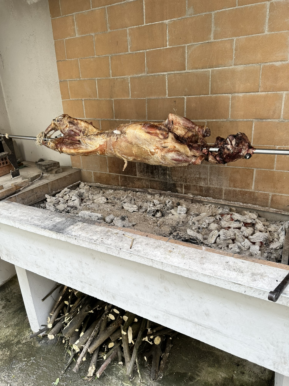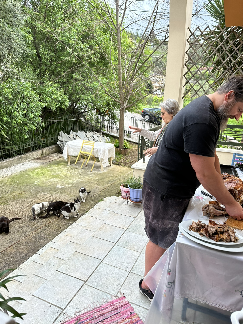부활절에는 그동안의 고기와 유제품 금식에서 해방되어 온 가족이 모여 양고기를 구워 먹는다. 그래서 보통 부활절 점심에는 온 동네에 고기 굽는 연기와 냄새가 진동한다. 아침에 눈을 뜨니 뒷마당에서 통구이가 벌써 돌아가고 있었다. 아침 7시부터 4-5시간을 약불에 천천히 굽기 때문에 맛이 없을 수가 없다.