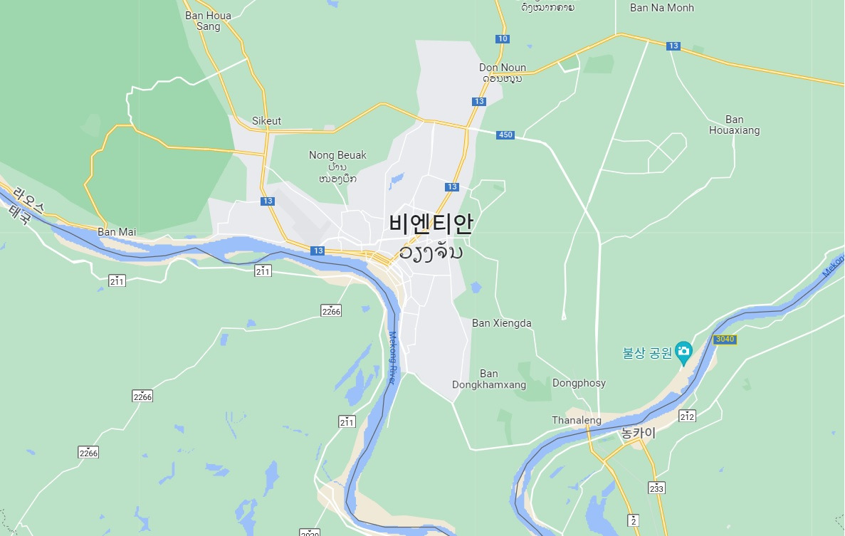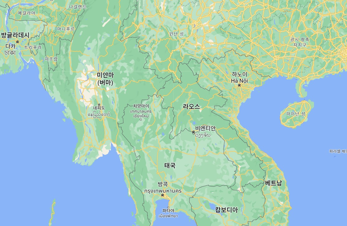 갑자기 라오스 비엔티안 방문 일정이 잡혀 태국 방콕에서 이동 방법과 숙소를 알아보게 되었다. 라오스가 어떤 나라인지 간단히 지도를 검색해 보았다. 라오스는 북서쪽으로 미얀마(버마), 남서쪽으로 태국, 남쪽으로 캄보디아, 남동쪽으로 베트남, 북쪽으로 중국과 국경을 인접하고 있는 동남아 거점 내륙국가이다. 아래 지도에서 보듯 진한 녹색 부분이 산지로 라오스의 척박한 지형조건을 한눈에 쉽게 확인된다.