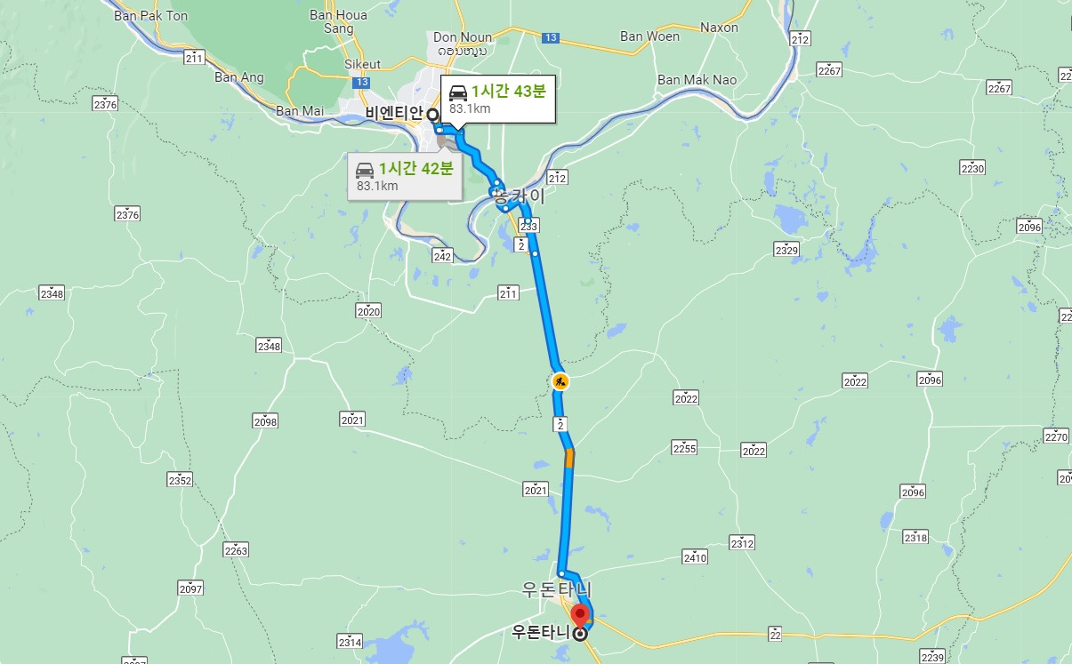 하지만 시간적인 여유가 많고 자유여행하는 성인이라면 합리적인 루트. 방콕 돈무앙공항에서 우돈타니 공항까지 비행시간이 1시간 정도 소요되며 우돈타니에서 라오스 비엔티안까지 차편으로 약 90km 2시간 정도 예상되지만 중간에 출입국사무소를 통과하기 위한 시간까지 고려한다면 약 5시간 이상 소요 예상된다.
