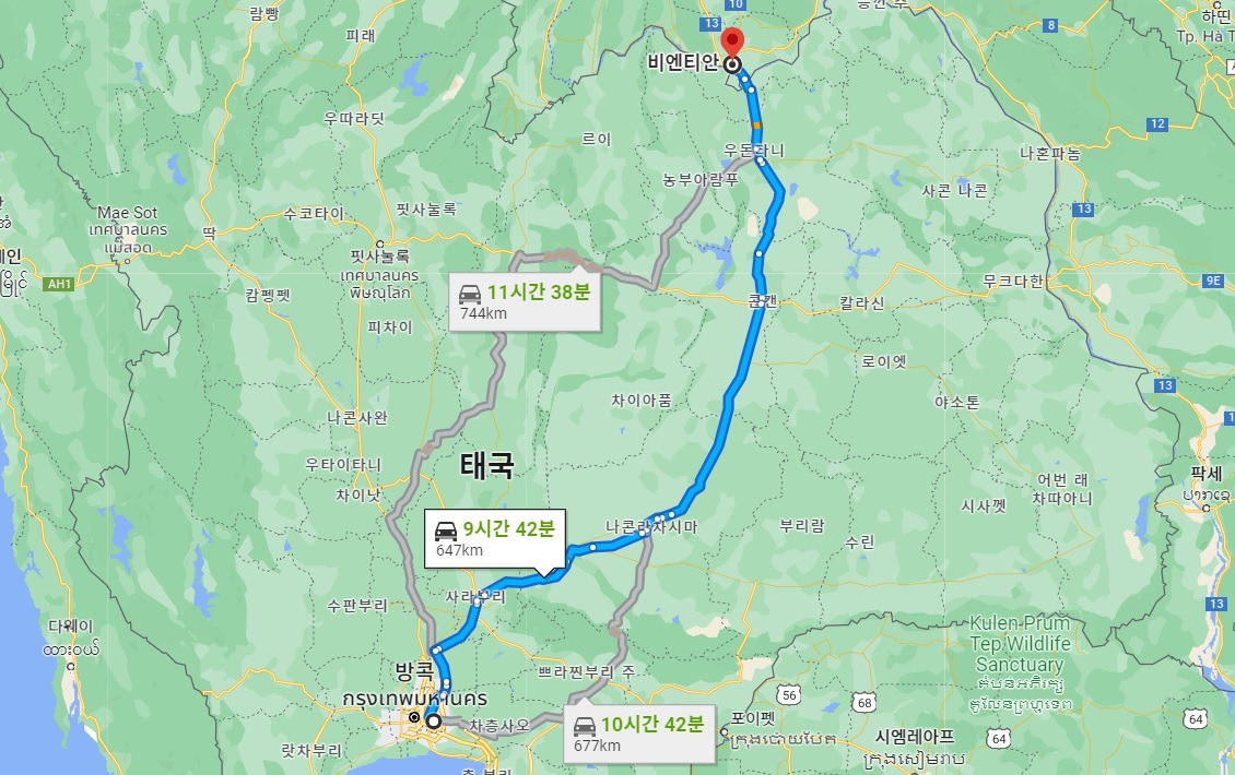 구글 지도를 이용하여 현재 있는 방콕에서 라오스 비엔티안까지 거리는 약 700km 이동시간은 약 10시간 이상 소요된다. 기타 대중교통으로는 이동 방법이 검색되지 않는 것으로 보아 렌트나 큰 지방도시 (나콘라차시마 > 콘캔 > 우돈라니)를 버스 등을 이용할 수밖에 없어 보인다. 사실상 아이들과 함께 라오스 육로 이동은 거의 힘들어 보인다.