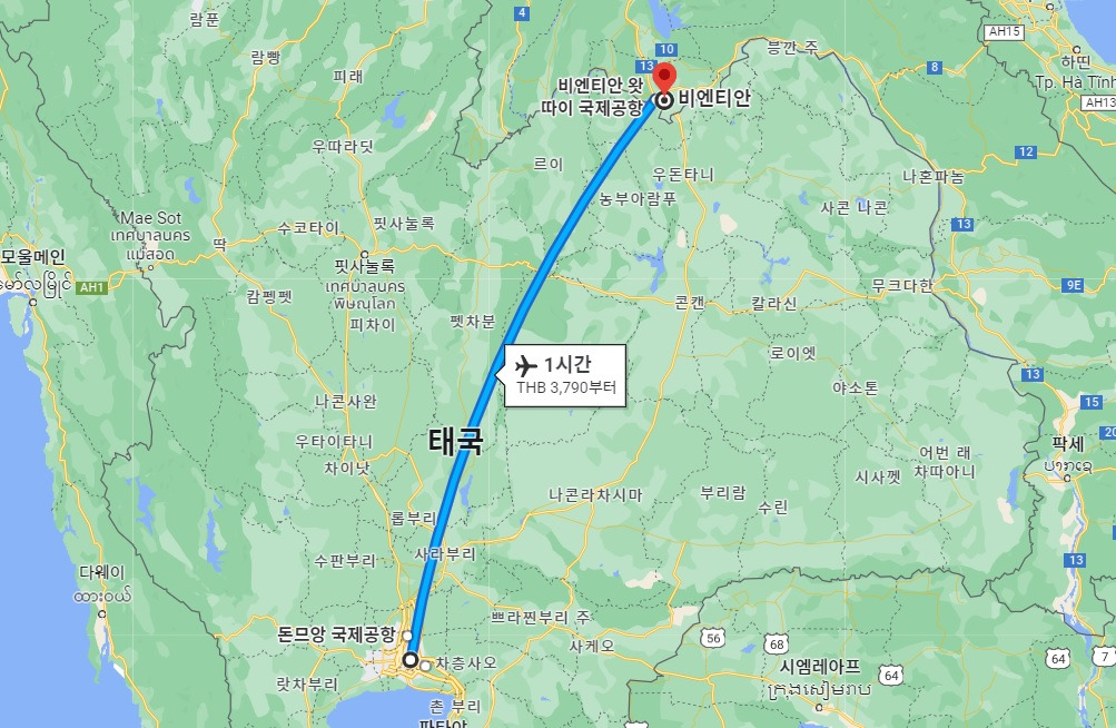 태국 방콕에서 라오스 비엔티안으로 이동할 경우 차편이 불명확한 육로보다 항공편으로 이동하는 것이 합리적이다. 방콕에서 비엔티안 항공편 비용은 왕복 20~30만 원대로 방콕 돈무앙과 방콕 수완나품 공항 2곳이 있으며 저가항공사인 에어아시아를 이용할 경우 돈무앙공항에서 국적기를 이용할 경우 수완나품에서 출발해야 한다.