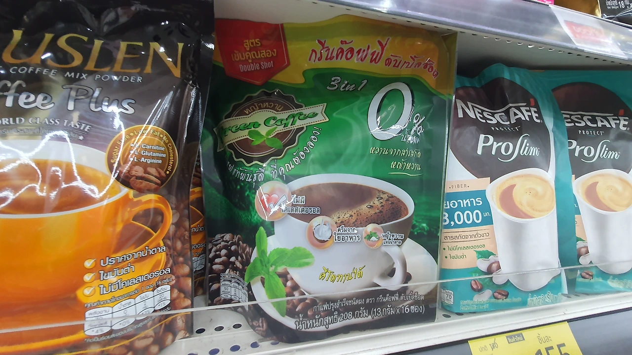 제가 즐겨 마시는 인스턴트커피는 설탕과 프림 없는 카누 같은 아메리카노 커피입니다. 하지만 태국에서 입맛에 맞는 커피를 고르기가 왜 그리 어려운지요. 그 흔한 아메리카노 커피가 잘 없습니다. 대형마트 커피 매대는 한 면을 가득 메우고 있지만 대부분 달달한 크림+설탕+커피 믹스입니다. 이곳에서는 3 IN 1으로 표시하고 있지만 제품마다 디자인이 달라서 믹스커피인지 아닌지 찾는 것에만 몇 분이 지나가 버립니다.