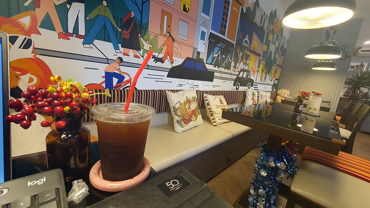 카페 사장님은 30대 초반 태국인 남성이지만 하얀색 피부와 양쪽 귀에는 조그만 귀걸이를 하고 밝은 브라운으로 염색한 투블럭 댄디컷의 깔끔한 외모를 가지고 있다. 작은 체구지만 얼굴과 체형의 발란스가 잘 맞아 옷까지 맞춰 입으면 한국의 MZ세대 스타일과 비슷하다. 그래서인지 아침 시간부터 아이들을 데려다주고 아침 시간이 남는 엄마들의 만담 장소로 애용되고 있다. 태국 엄마들도 모이니 회이팅이 만만치 않다. 하지만 무슨 말인지 도통 알 수가 없으니 주변 이야기는 백색소음 일뿐 글쓰기에 지장 없다.