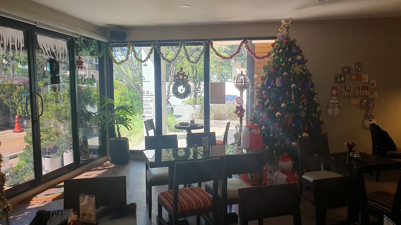 댄디한 태국의 MZ세대 사장님은 본인 스타일 외에도 카페 관리에도 진심이다. 11월 말부터 준비하기 시작한 크리스마스 장식을 혼자서 며칠 동안 부지런이다. 20평 남짓의 홀에 2m가 넘는 크리스마스트리를 위해 2인용 테이블을 홀에서 빼버리는 손해도 감수한다. 그리고 테이블 다리와 전등의 등마다 반짝거리는 데코와 스노볼, 꽃장식 등 빈틈없이 장식해놓았다. 음악은 80~90년대 올드 캐럴을 틀어놓으니 하와이안 크리스마스 분위기다. 화이트 크리스마스만 진실인 줄 알았지만 뜨거운 바람과 함께하는 끈적한 크리스마스도 나름 이색적이다.