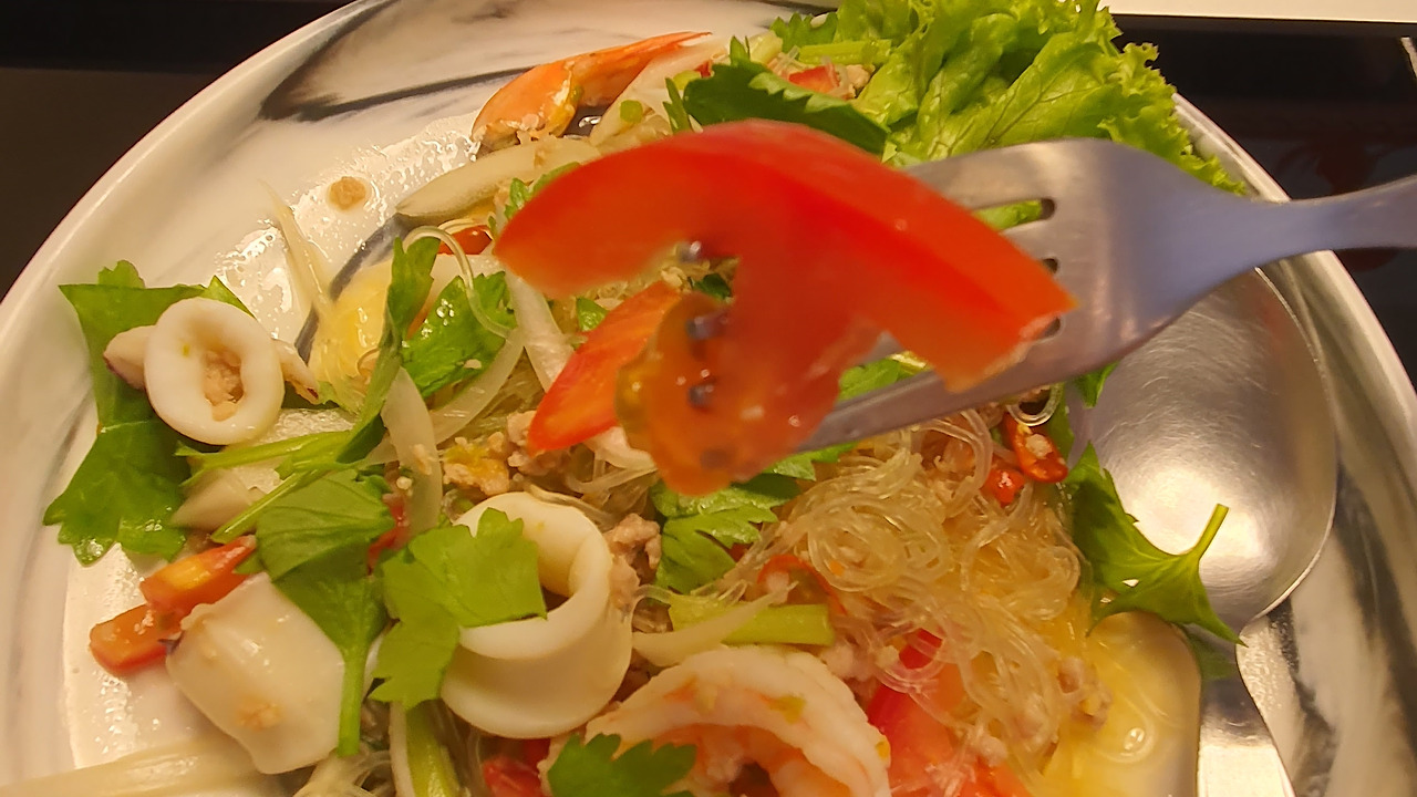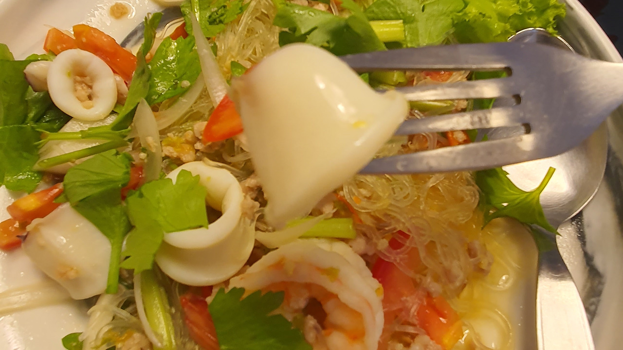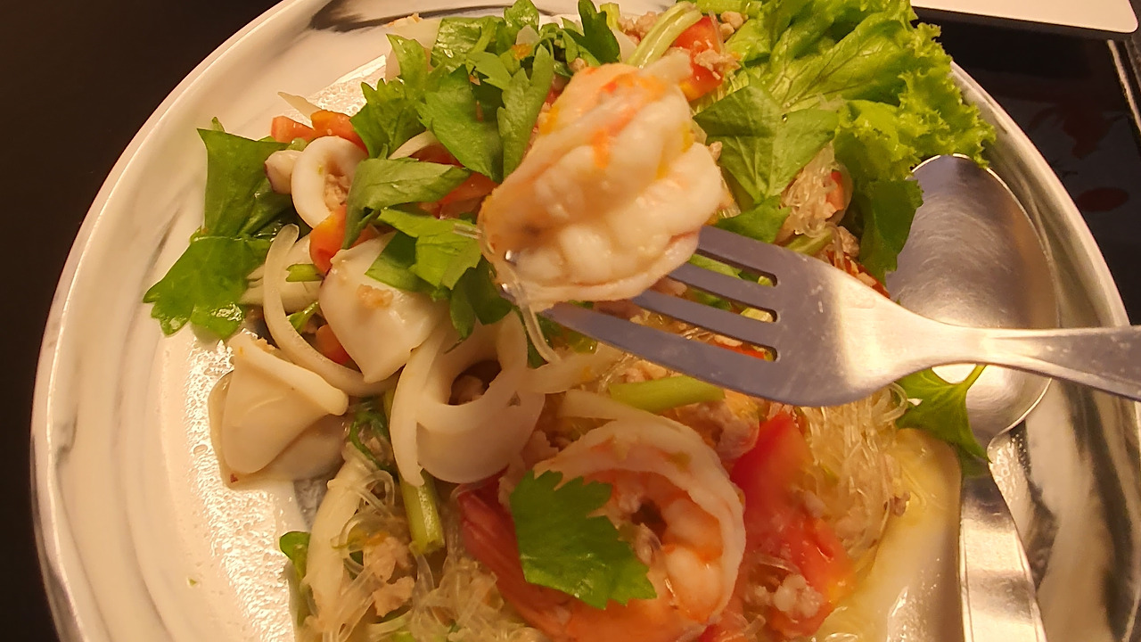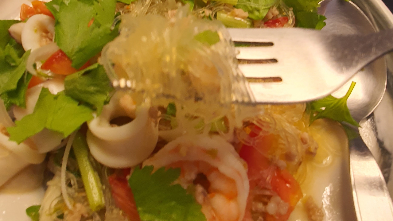 얌운센의 '얌은 섞다, 운센은 당면'의 뜻으로 얇은 글라스 누들을 각종 재료 섞어 먹는 일종의 비빔국수다. 한국의 비빔국수는 고추장, 간장, 식초 등 발효된 장의 깊고 은은한 맛이 베이스라면 태국의 얌운센은 라임, 고추, 설탕 등 가볍고 신선한 풍미가 특징이다. 태국 음식에 해산물이 들어가면 가격이 올라간다. 특히 새우는 닭고기나 돼지고기에 비해 20% 정도 비싸다. 일반 단품 80밧(3,200원)인데 얌운센 샐러드가 95밧(약 4,000원)이니 메인 음식보다 비싸지만 얌운센에는 해물이 들어있다.