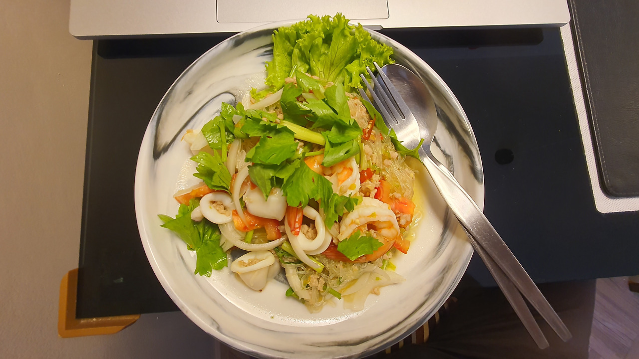 얌운센은 솜땀과 함께 태국의 대표적인 식전 음식으로 새콤 달콤 매콤한 소스에 오징어, 새우와 다진 돼지고기, 토마토와 각종 채소가 들어가 있어 식사대용으로도 부족함이 없다. 추가로 간이 약한 팟카오(볶음밥)와 함께 주문한다면 느끼함은 잡아주고 고소함이 더해져 잘 어울릴 듯하다. 얼마 되지 않는 양, 몇 번 포크질에 볶음밥을 주문할 타이밍을 놓치고 말았다. 다음부터는 얌운센과 팟카오를 같이 주문해서 먹어야 제맛일 듯하다.