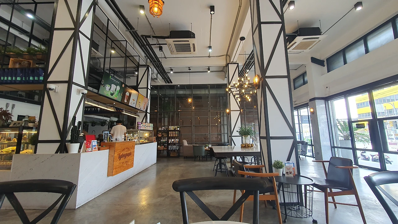 사람 많은 도심이 아닌 차만 많이 지나다니는 대도로, 이런 자리에도 제법 큰 카페가 있다. 카페라기보다 공장 같은 인더스트리얼 분위기에 내부가 넓다. 30평 정도의 홀에 20평의 넓은 주방이 있다. 베이커리형 카페로 빵과 커피가 주력인 카페이다. 2층은 코워킹스페이스로 10평 가량의 회의실이 위치해 아마도 제빵기술을 교육하는 학원을 겸하는 듯 하다. 저스틴비버의 노래가 이 카페의 분위기를 잘 나타낸다. 일요일 오후라 지나다니는 사람보다 차가 많아 노래가 진한 엔진 소음에 묻혀 리듬만 들릴 뿐이다.