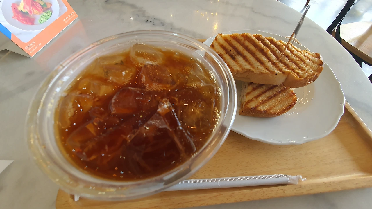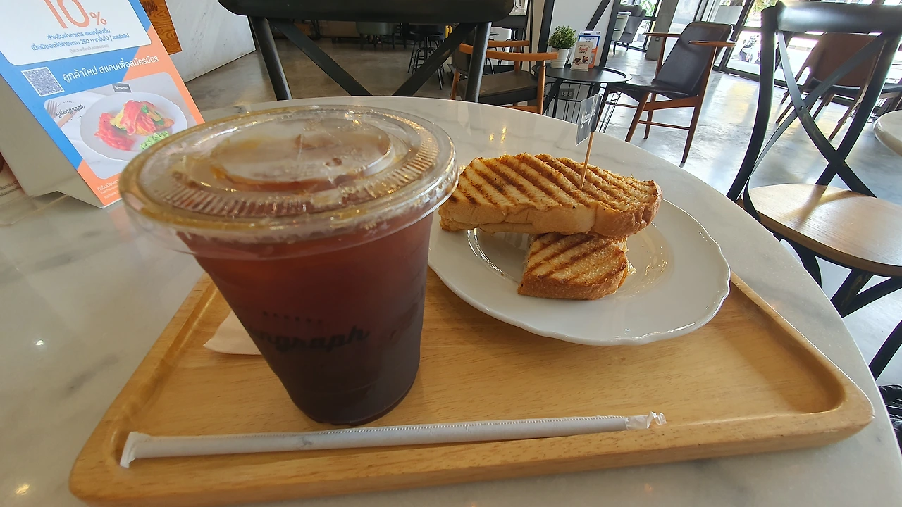 주문한 아이스 아메리카노가 먼저 나온다. 맛을 보니 다크 한 맛에 새콤한 과일향이 올라온다. 태국의 아라비카는 새콤한 과일향과 끝에 매운 향이 약하게 올라오는 특징이 있다. 아마도 태국 북부 치앙마이나 치앙라이 미디엄 원두를 추출한 시그니처 아메리카노처럼 느껴진다. 너무 가볍지고 않고 적당히 바디감도 느껴지니 커피 같은 느낌도 나니 60밧(2,400원) 짜리 아이스 아메리카노의 품질치고 만족스럽다.