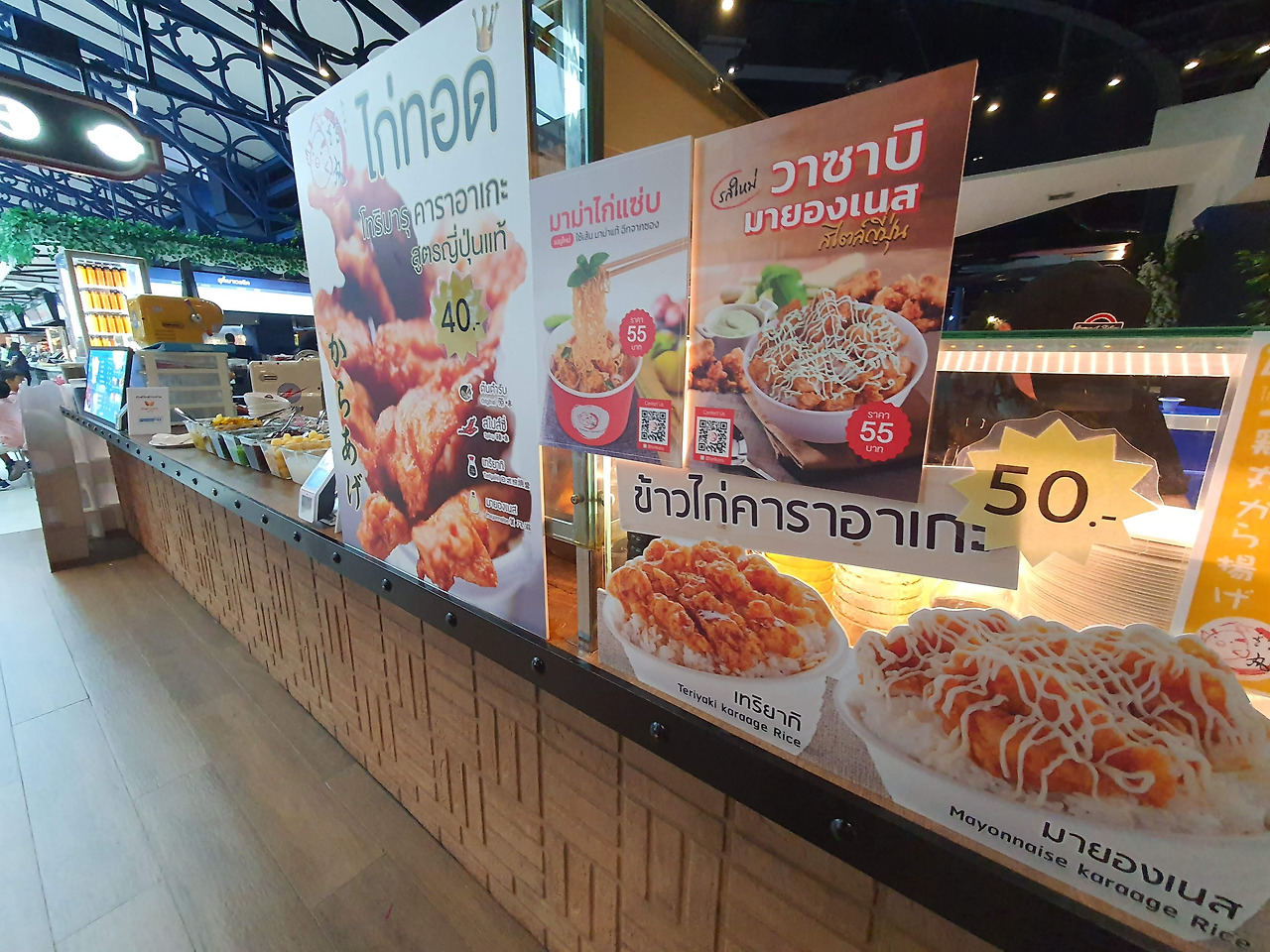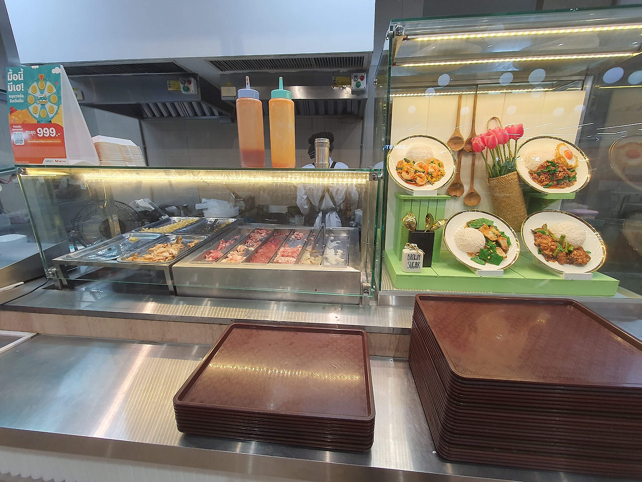 - 대형마트 푸드코트 : 대형마트의 주요 고객은 태국 현지인으로 주로 간단한 밥이나 면류의 로컬 메뉴로 구성된다. 가격은 약 50밧(2,000원) 내외로 마트에서 일하는 직원이나 로컬 고객들에게 합리적인 한 끼를 제공한다. 현지인의 입맛에 맞춰져 태국적인 맛이 강하다.
