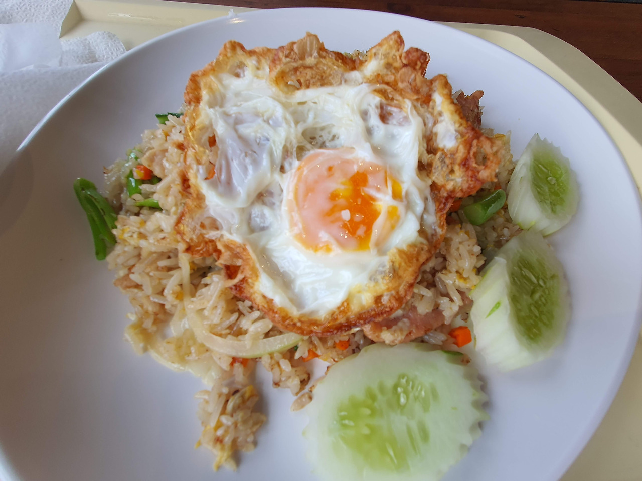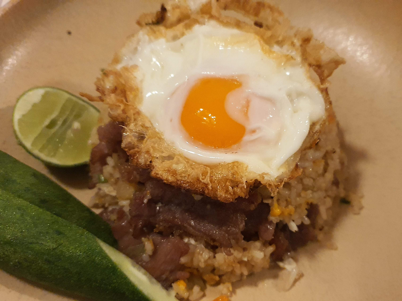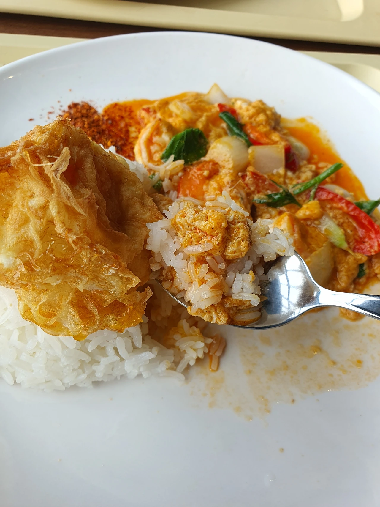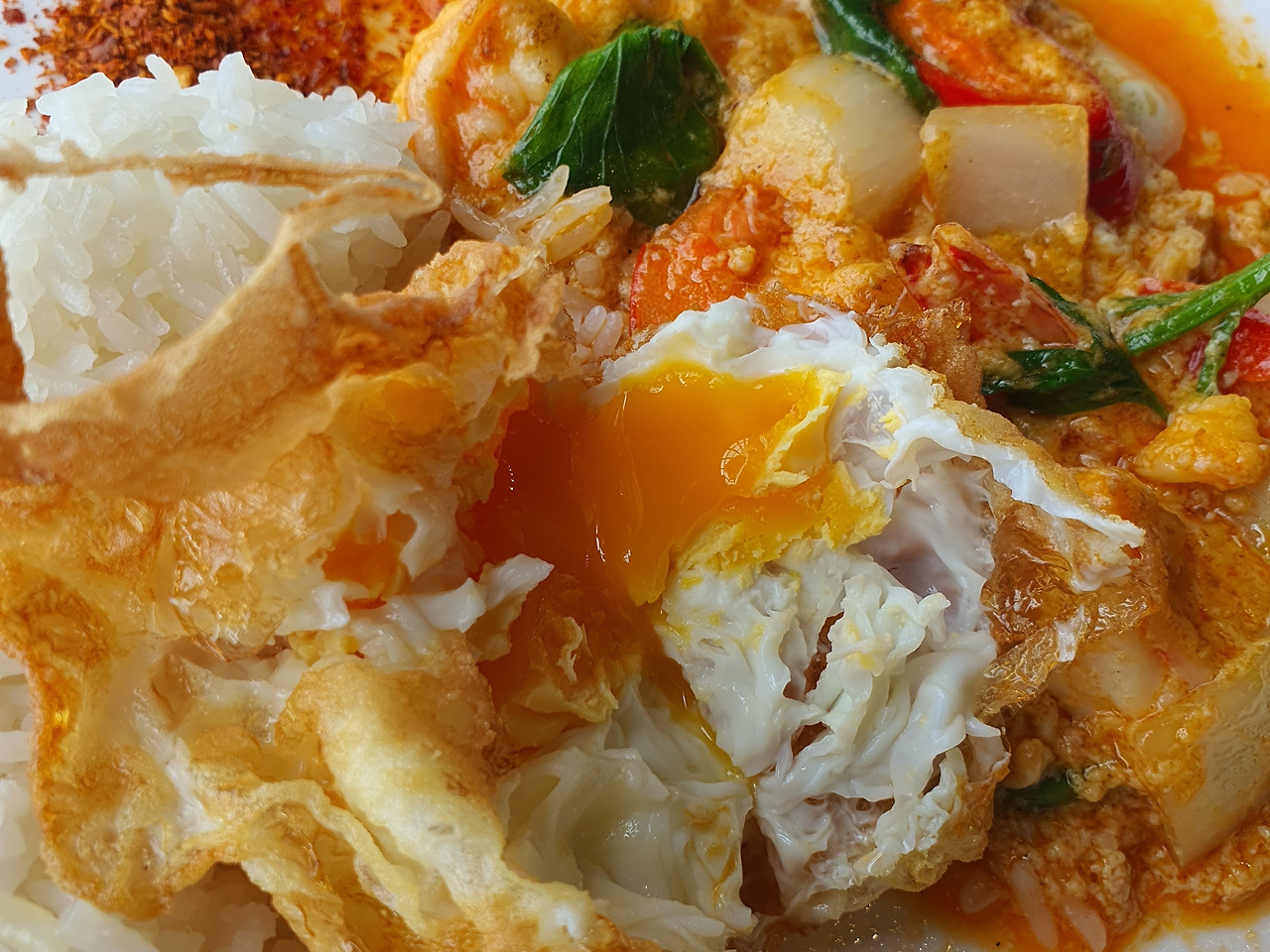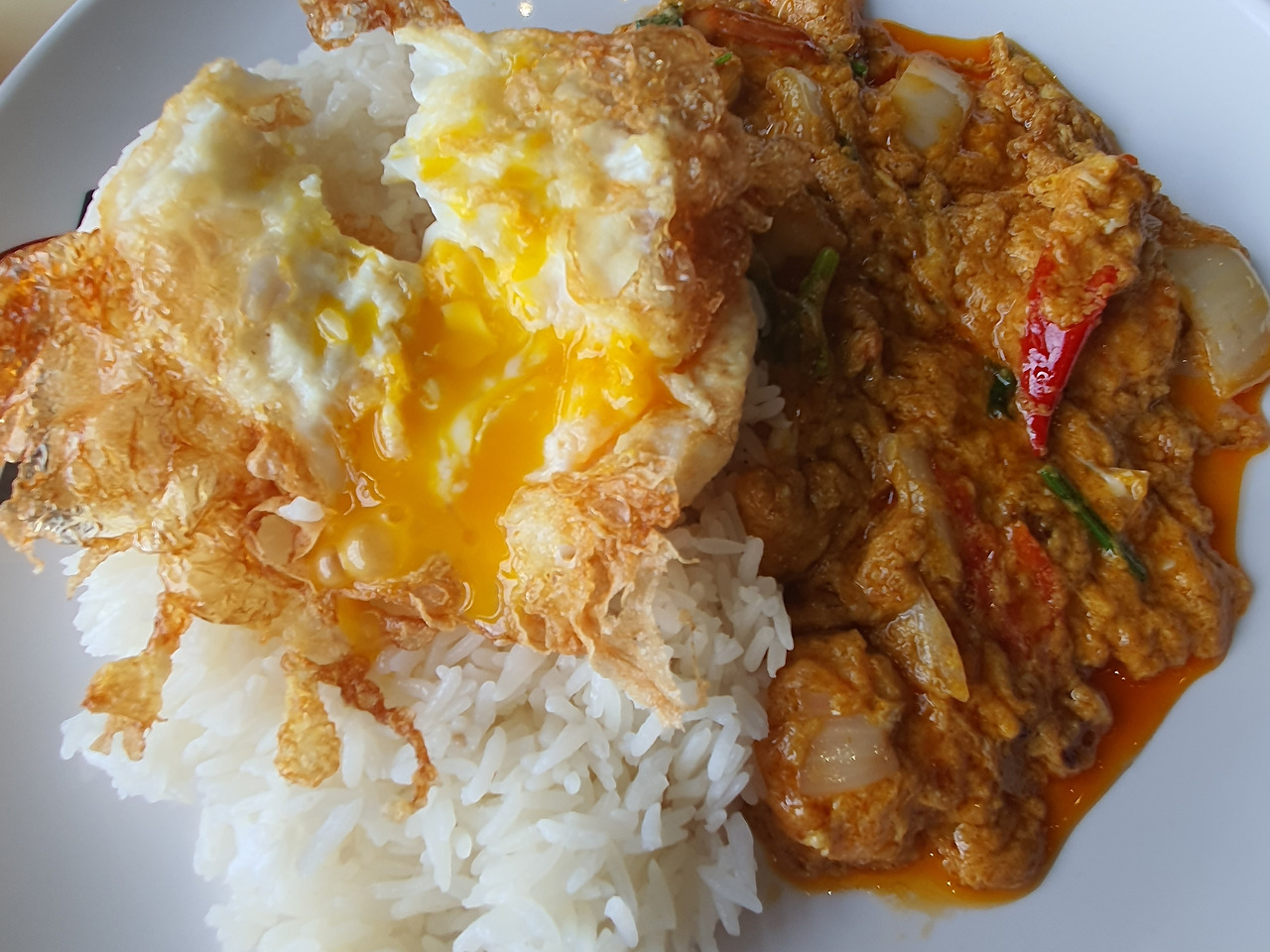 불맛이 날아갈세라 식기 전에 자리를 잡고 따끈한 재스민밥 한술을 떠서 소스를 올려 한입 맛보니 타이고추의 매콤함, 새우의 감칠맛, 양파의 달콤함과 불맛이 조화롭게 섞여있다. 잘 튀겨진 반숙계란을 반으로 나누어 카레와 밥을 적셔 올리니 고소한 맛까지 더해져 제대로 된 태국식 중화요리를 맛볼 수 있다.