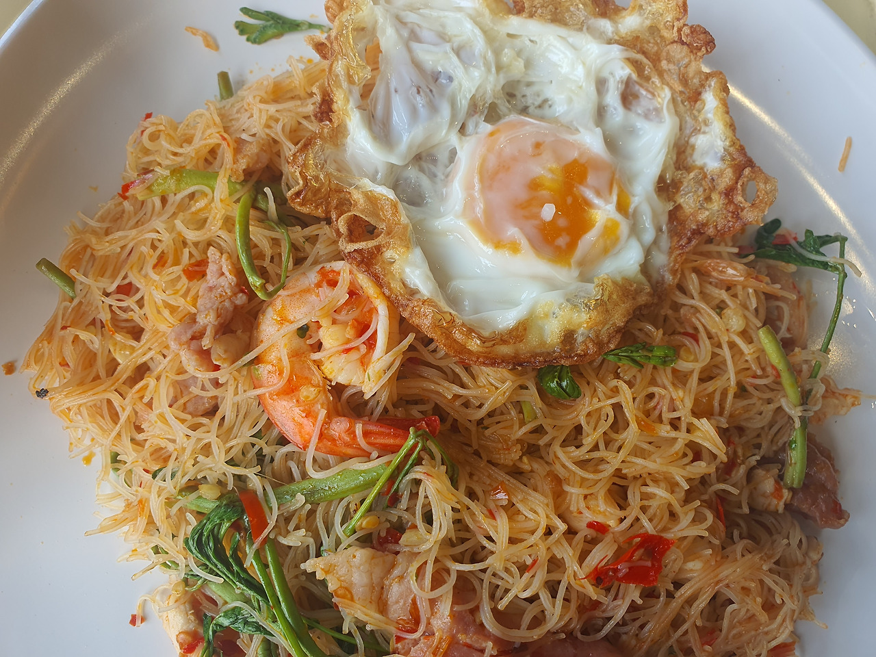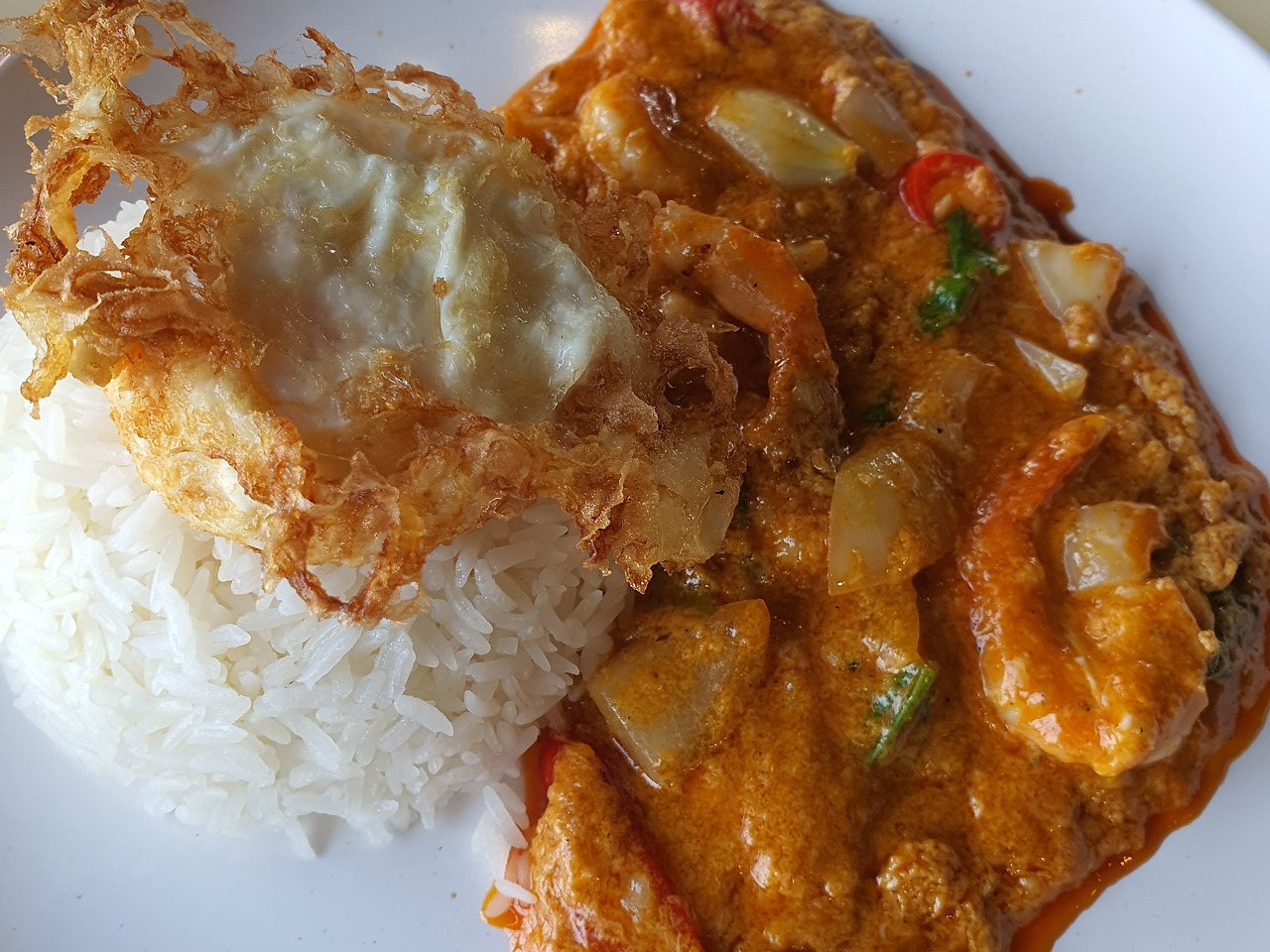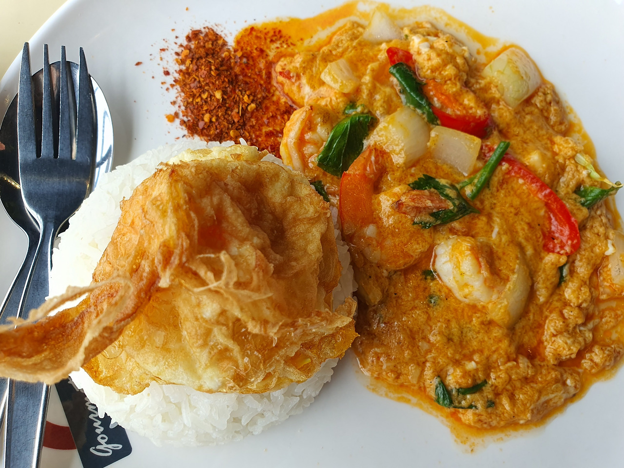 이 식당의 새우커리(꿍팟퐁커리)는 고추기름에 새우와 양파, 고추 등을 넣고 튀기듯 볶아 태국식 붉은 고추 페이스트와 계란과 코코넛밀크를 풀어 부드럽고 걸쭉하게 요리되어 나왔다. 뜨거운 화력에서 나오는 거대한 불이 웍을 감싸며 요리에 골고루 불맛을 잘 입힌다. 태국의 푸드코트에서 느껴보는 호텔급 요리에기대와 흥분이 교차한다.